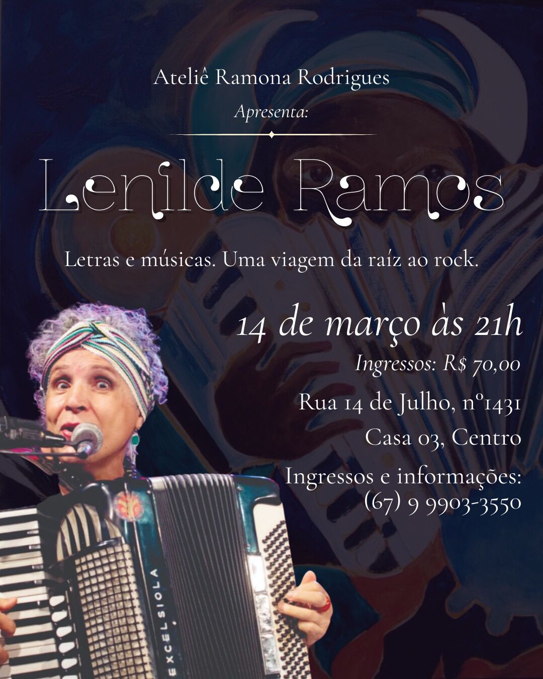 A musicista e compositora sul-mato-grossense Lenilde Ramos realiza, a partir das 21h de 14 de março, o show intitulado "Letras e músicas: Uma viagem da raiz ao rock", no Ateliê Ramona Rodrigues, em Campo Grande (MS).