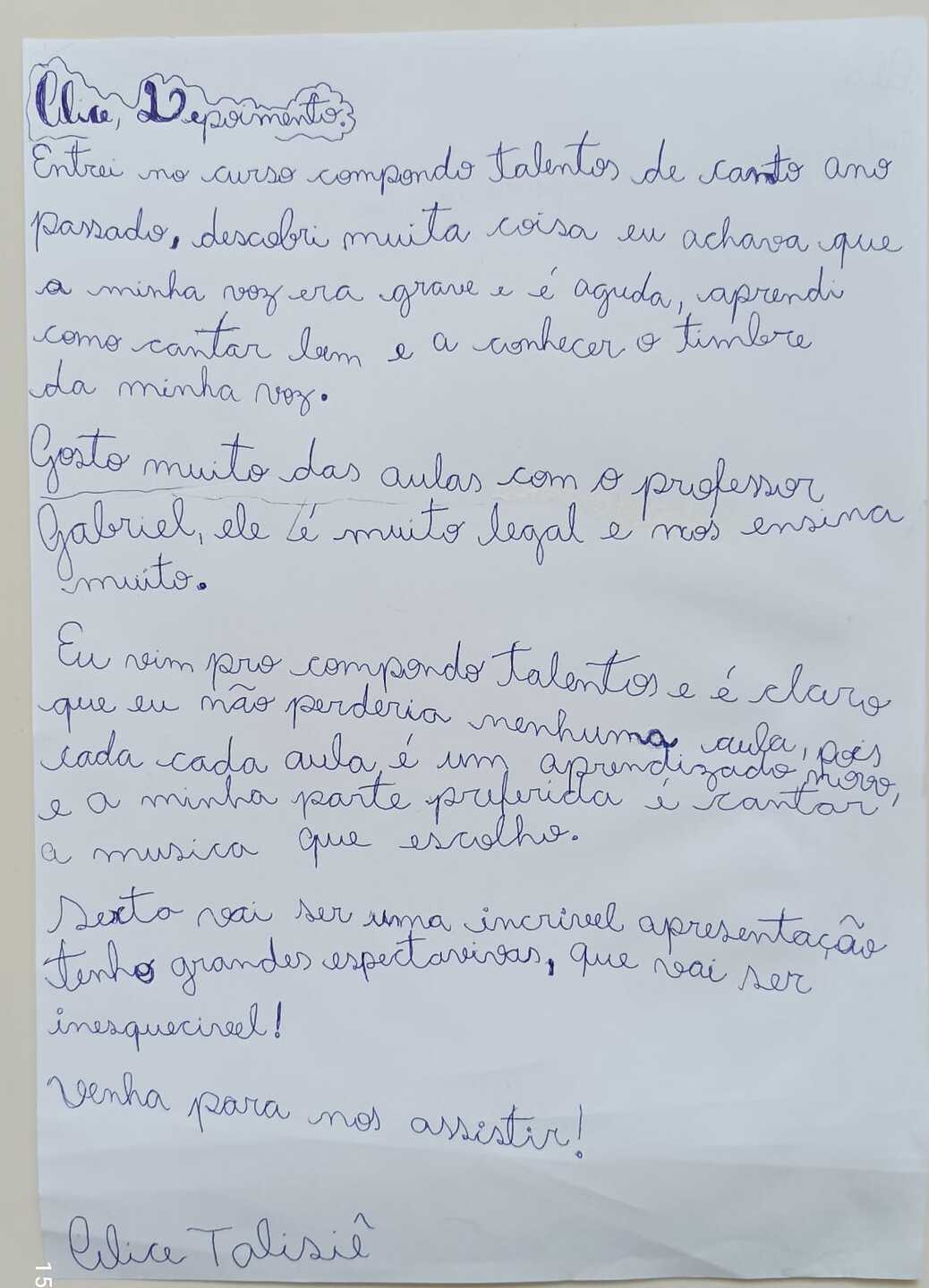 Alice Talisie, uma das alunas, registrou em carta, a percepção sobre a própria evolução técnica, mencionando a identificação de sua tessitura vocal e o controle do timbre. Leia a carta escrita pela aluna: