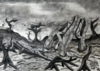 Tela mostra o bioma pantaneiro devastado pelas queimadas. Tela da exposição 'Cinzas da Floresta Bioma Pantanal: um chamado para a conservação das áreas úmidas à luz da COP 30'.