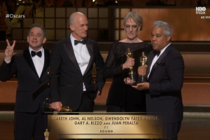 Da esquerda para a direita, a equipe de Two People Exchanging Saliva e a equipe de The Singers recebem o Oscar de Melhor Curta-metragem em raro empate, acompanhadas de frames que mostram cenas de ambos os filmes vencedores.