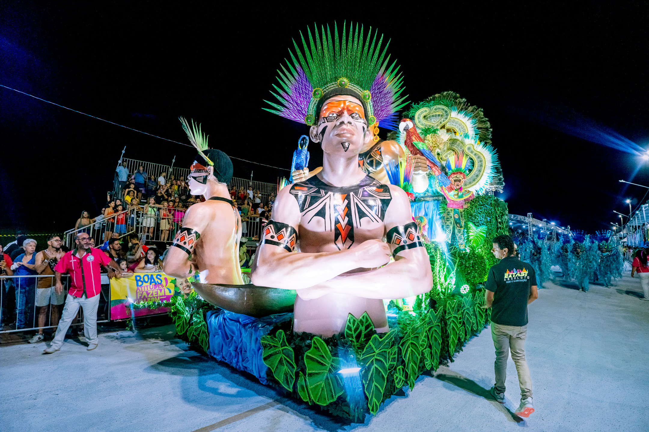Animal símbolo da Vila Carvalho foi representado no enredo da escola de samba | Foto: Tero QueirozEm entrevista ao TeatrineTV após o desfile, o presidente Wlauer Castro Carvalho, de 52 anos, explicou que o tema partiu da identidade da própria agremiação, que possui uma comissão de carnaval responsável pela construção do enredo. “A gente escolheu [o enredo] porque a arara-azul, se vocês olharem, é o símbolo da nossa escola. E aí, a gente tem mesmo que fazer sobre o meio ambiente por causa dessa depredação, essa devastação”.
