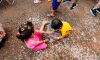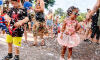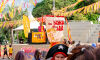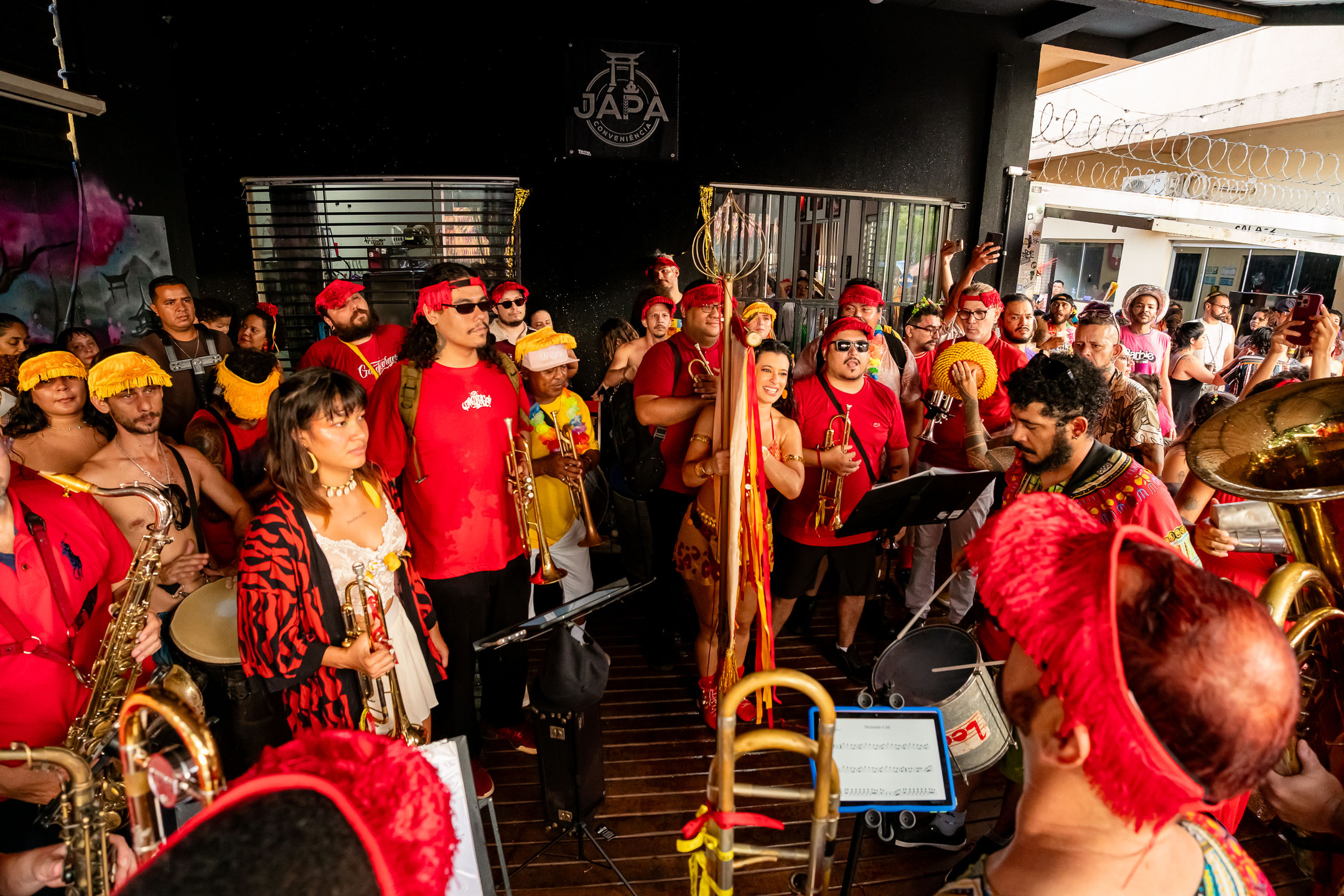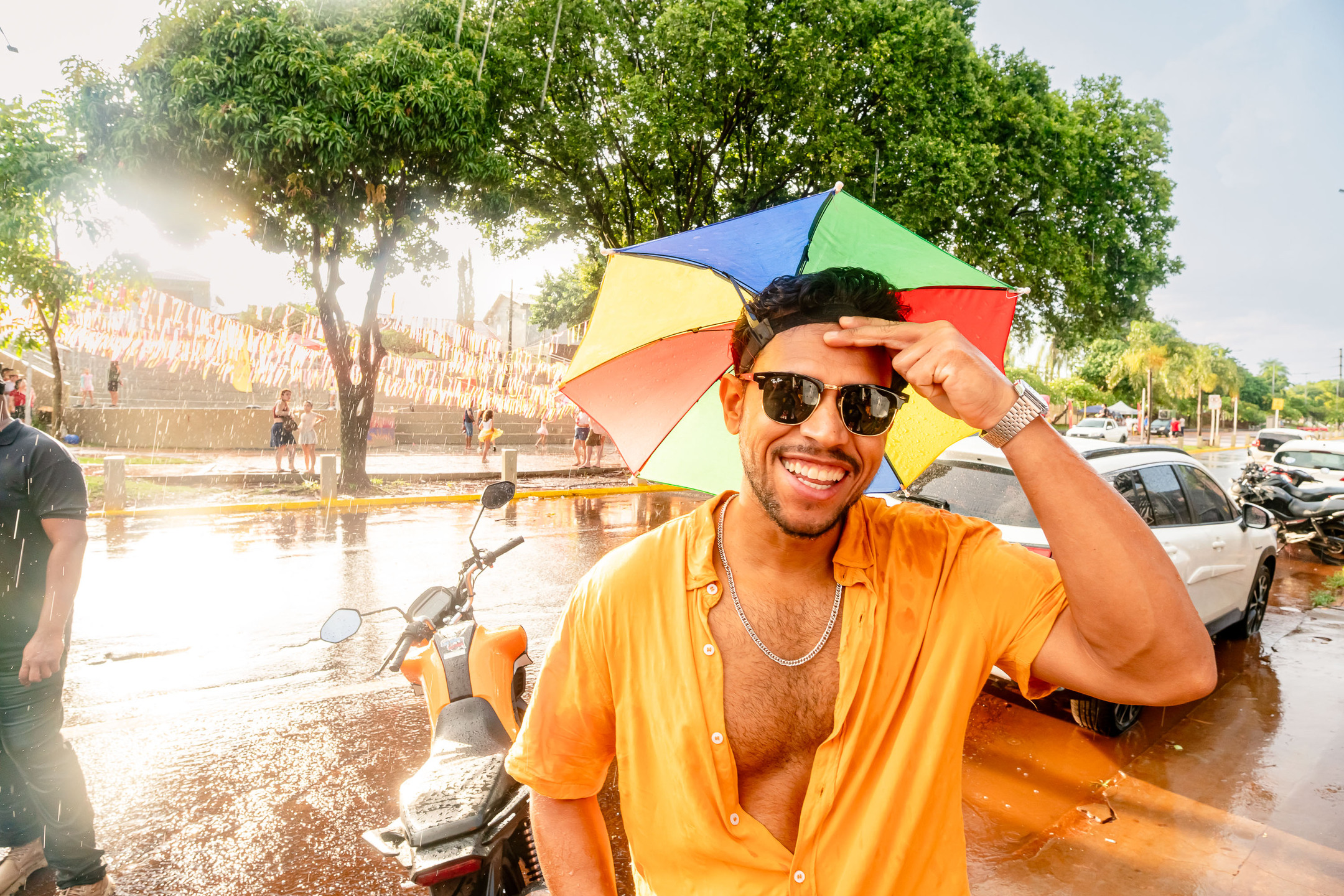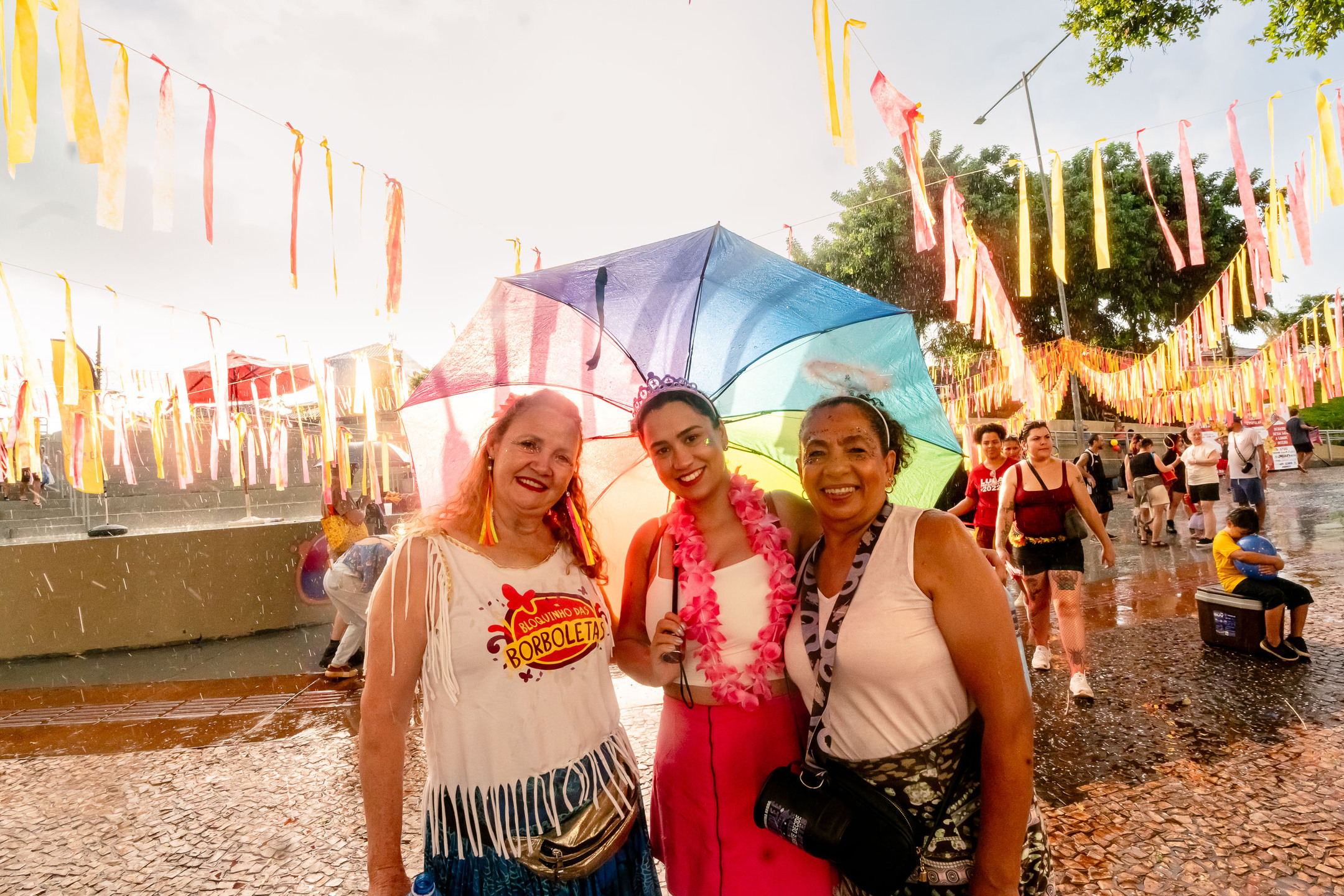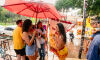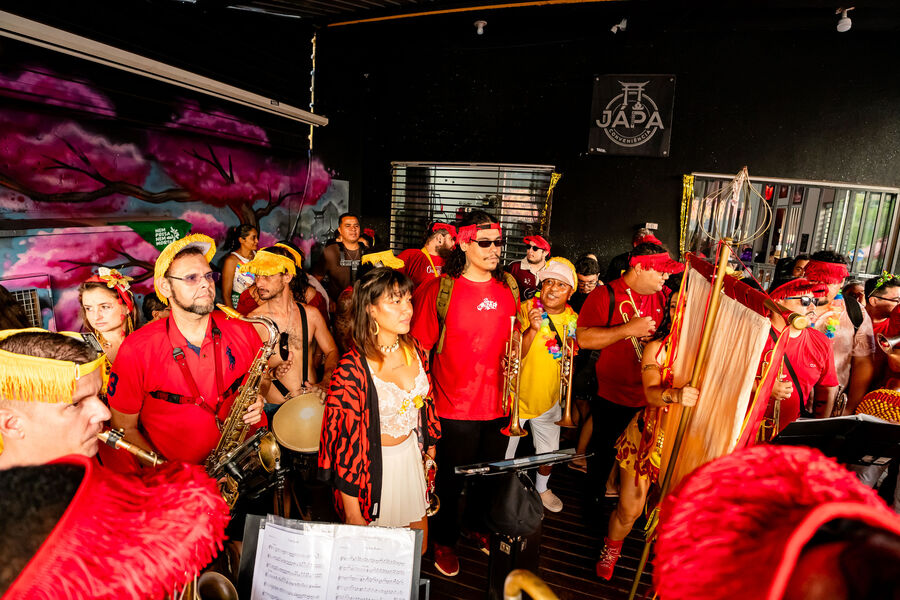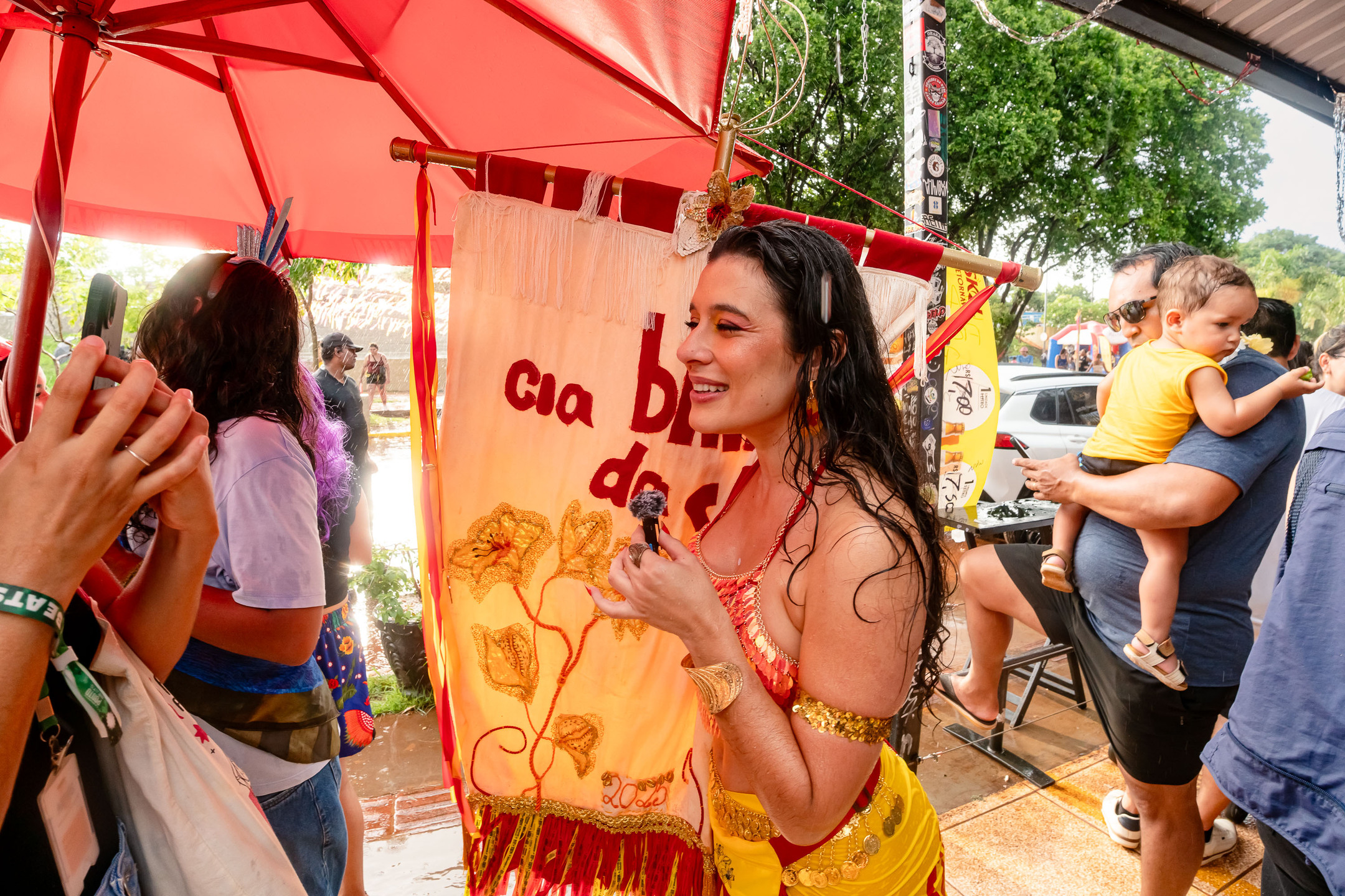 Eles foram atingidos por uma chuva intensa por volta das 16h30 e tiveram que se abrigar em tendas e no Japa Bar, local que serviu como palco para aquecimento da banda que tocou no cortejo.