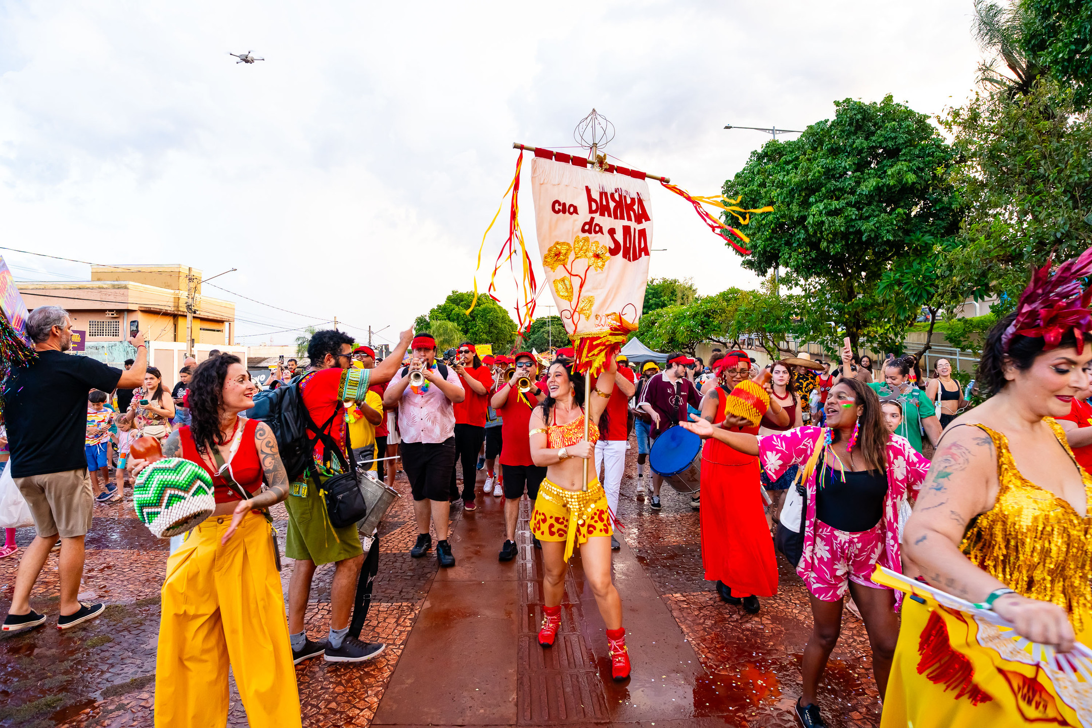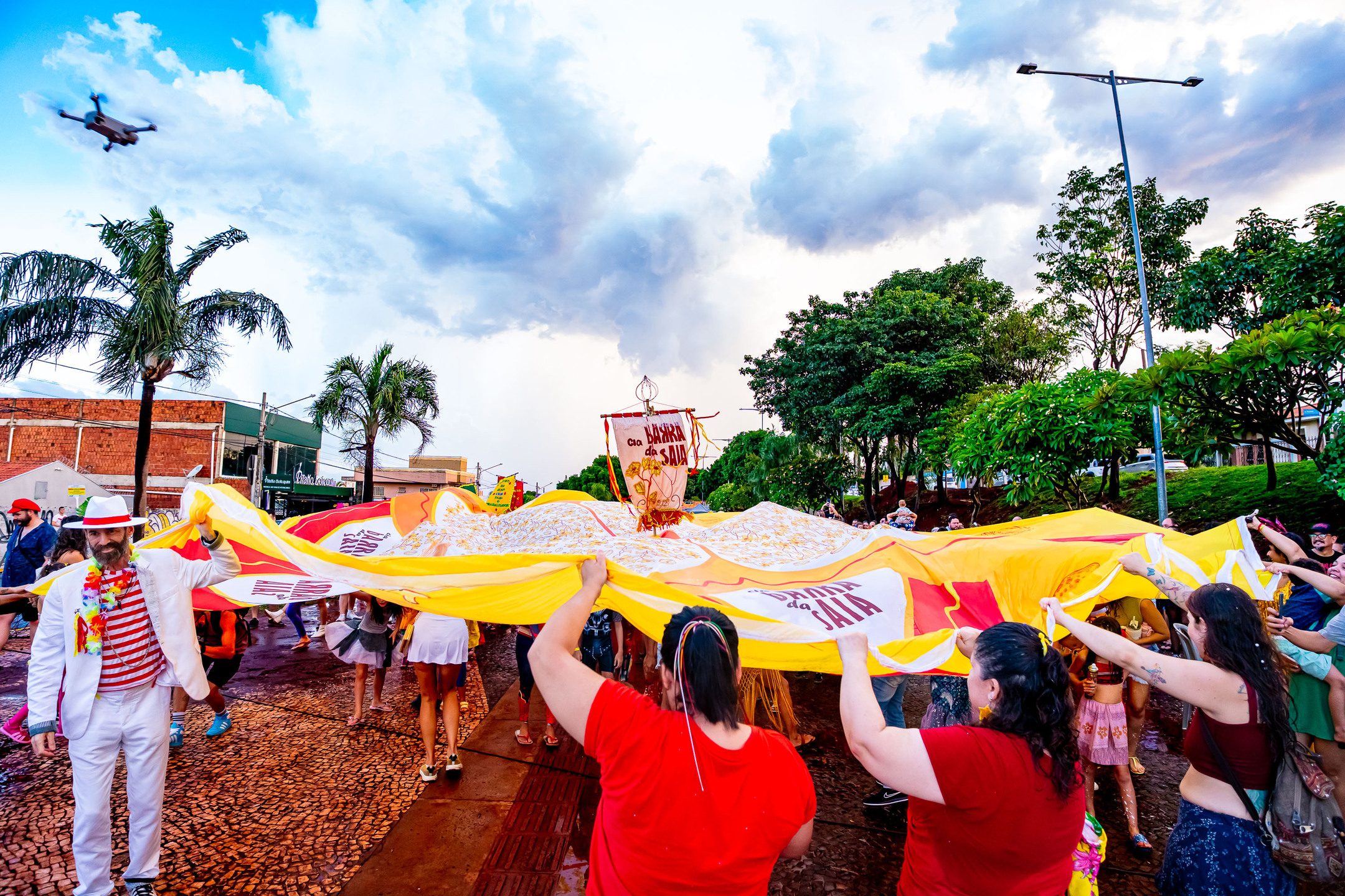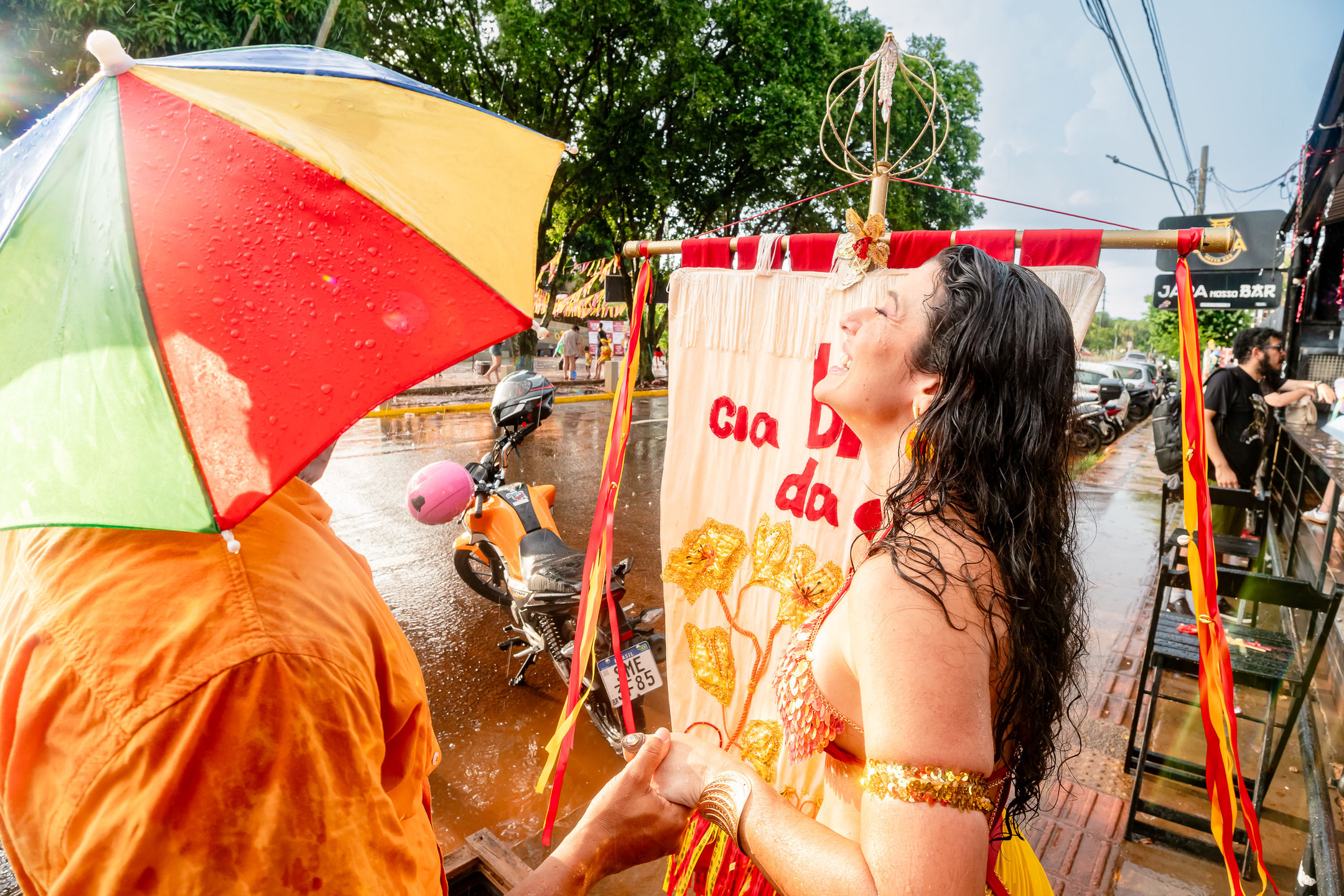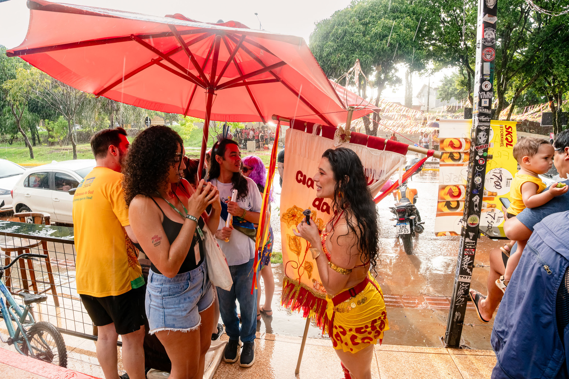 A chuva, que durou cerca de uma hora, adiou um pouco a saída do cortejo do Palco de Arena da Orla Morena até o início da Orla, no cruzamento com a Rua Plutão, onde o palco da Cia Barra da Saia estava montado.