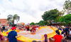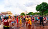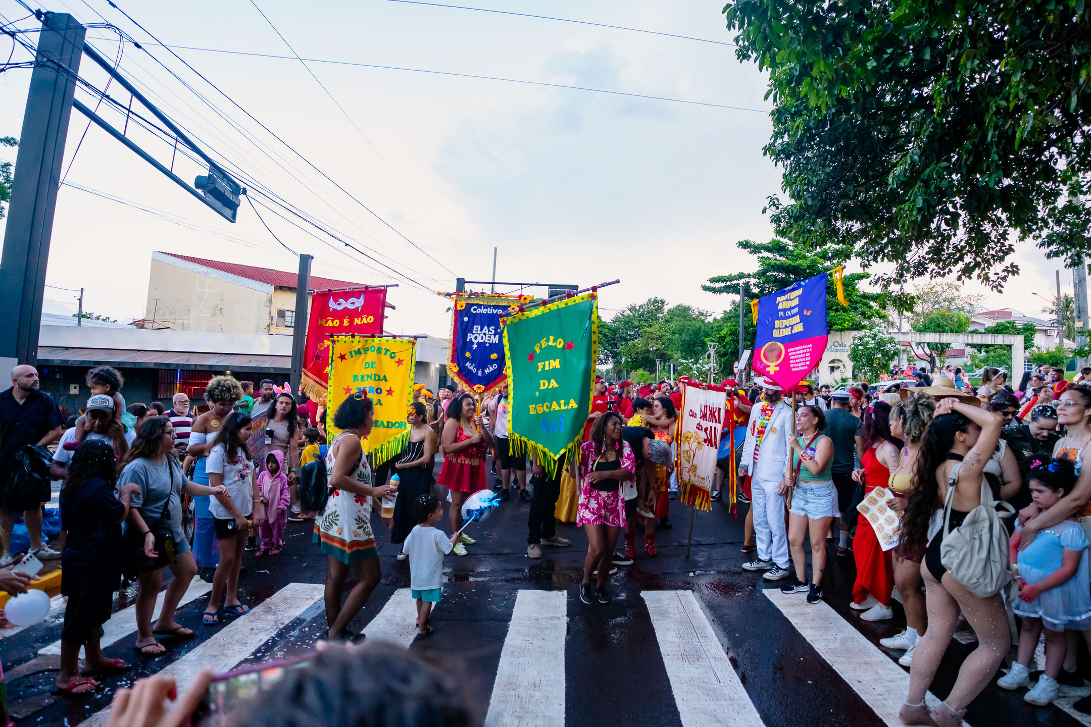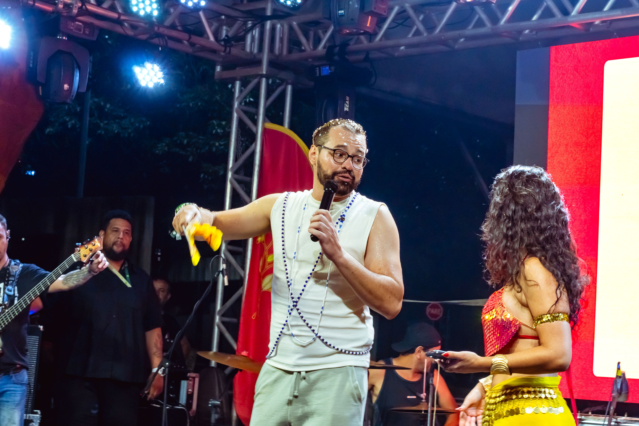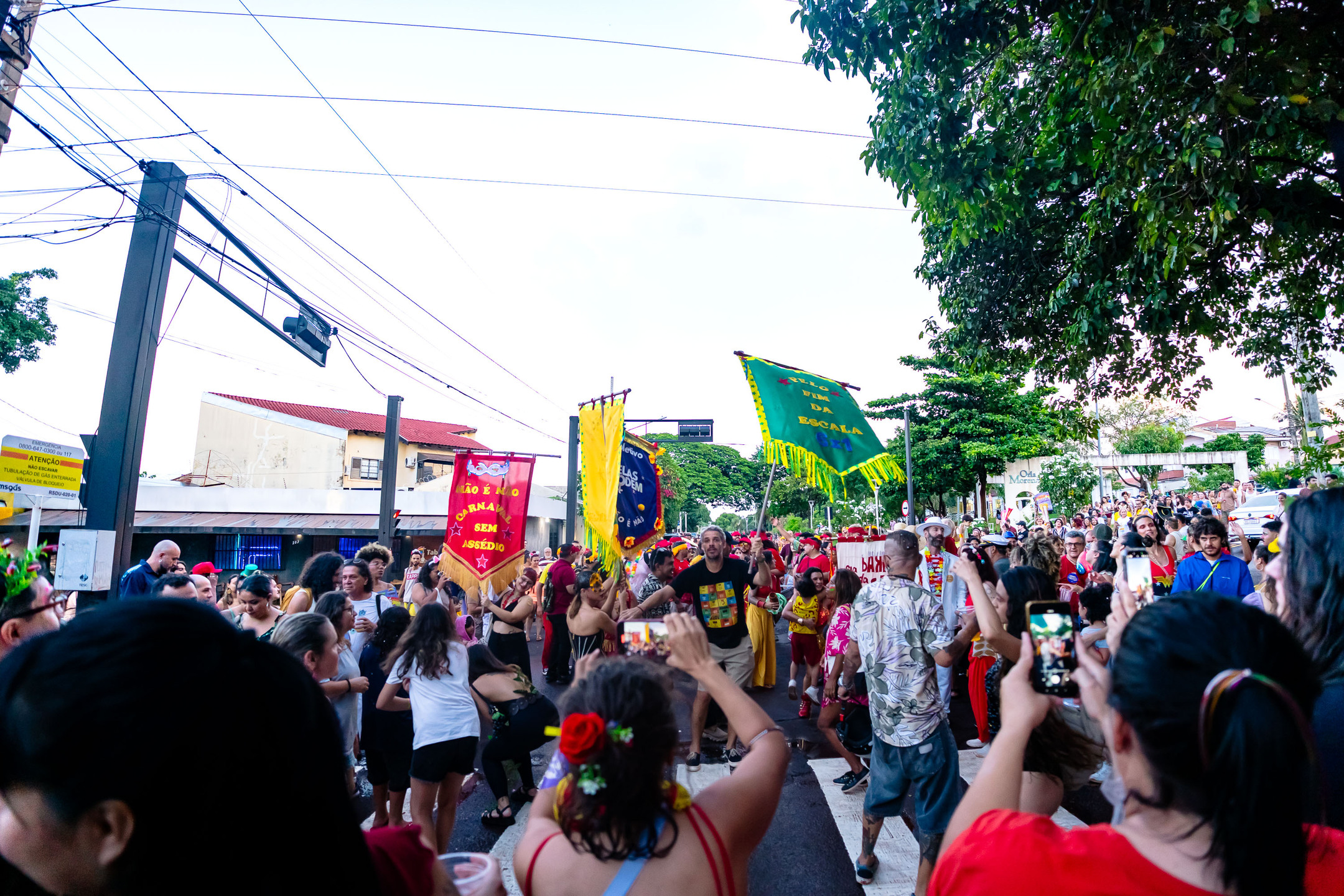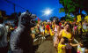 A chuva, que durou cerca de uma hora, adiou um pouco a saída do cortejo do Palco de Arena da Orla Morena até o início da Orla, no cruzamento com a Rua Plutão, onde o palco da Cia Barra da Saia estava montado.