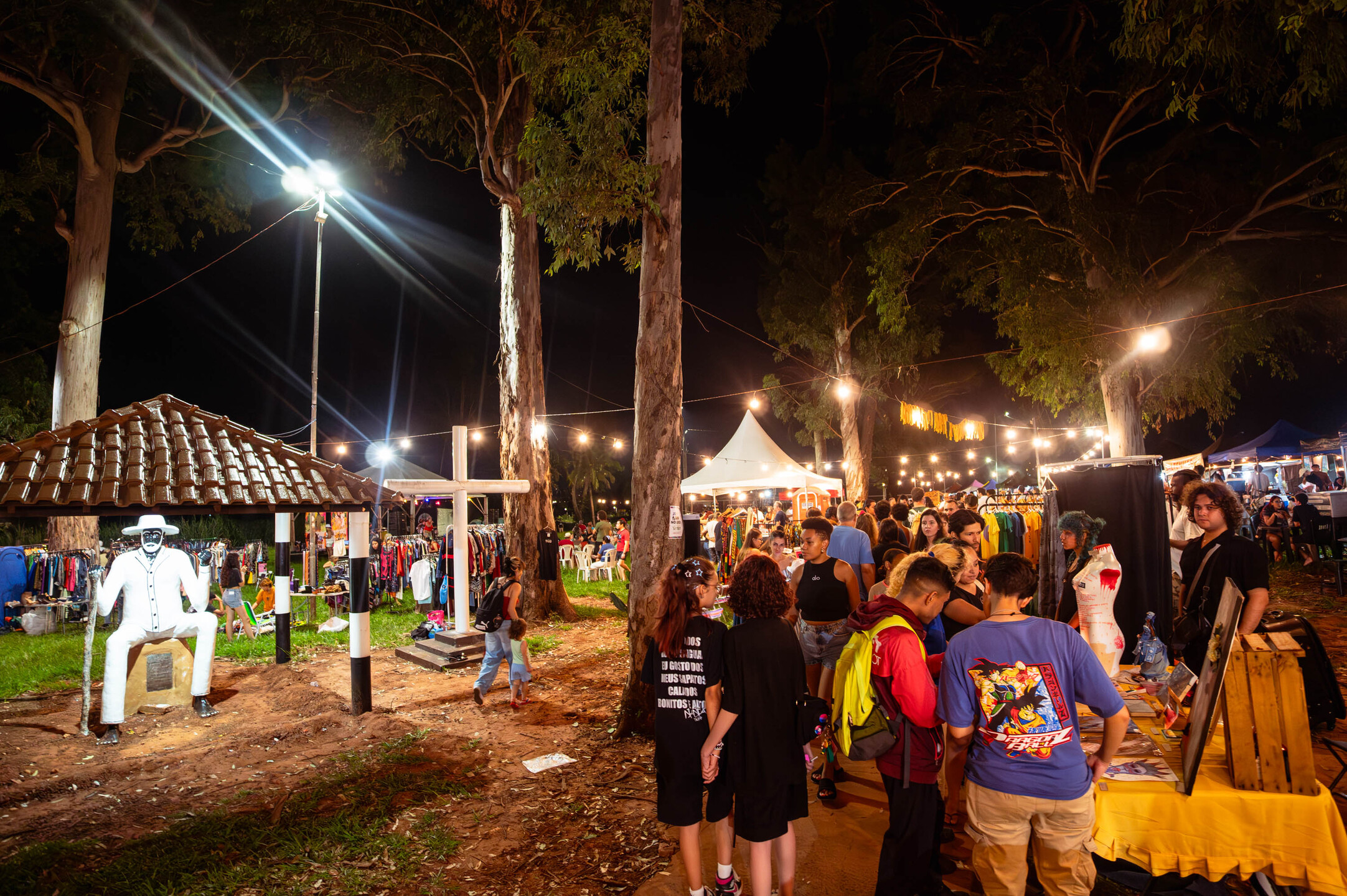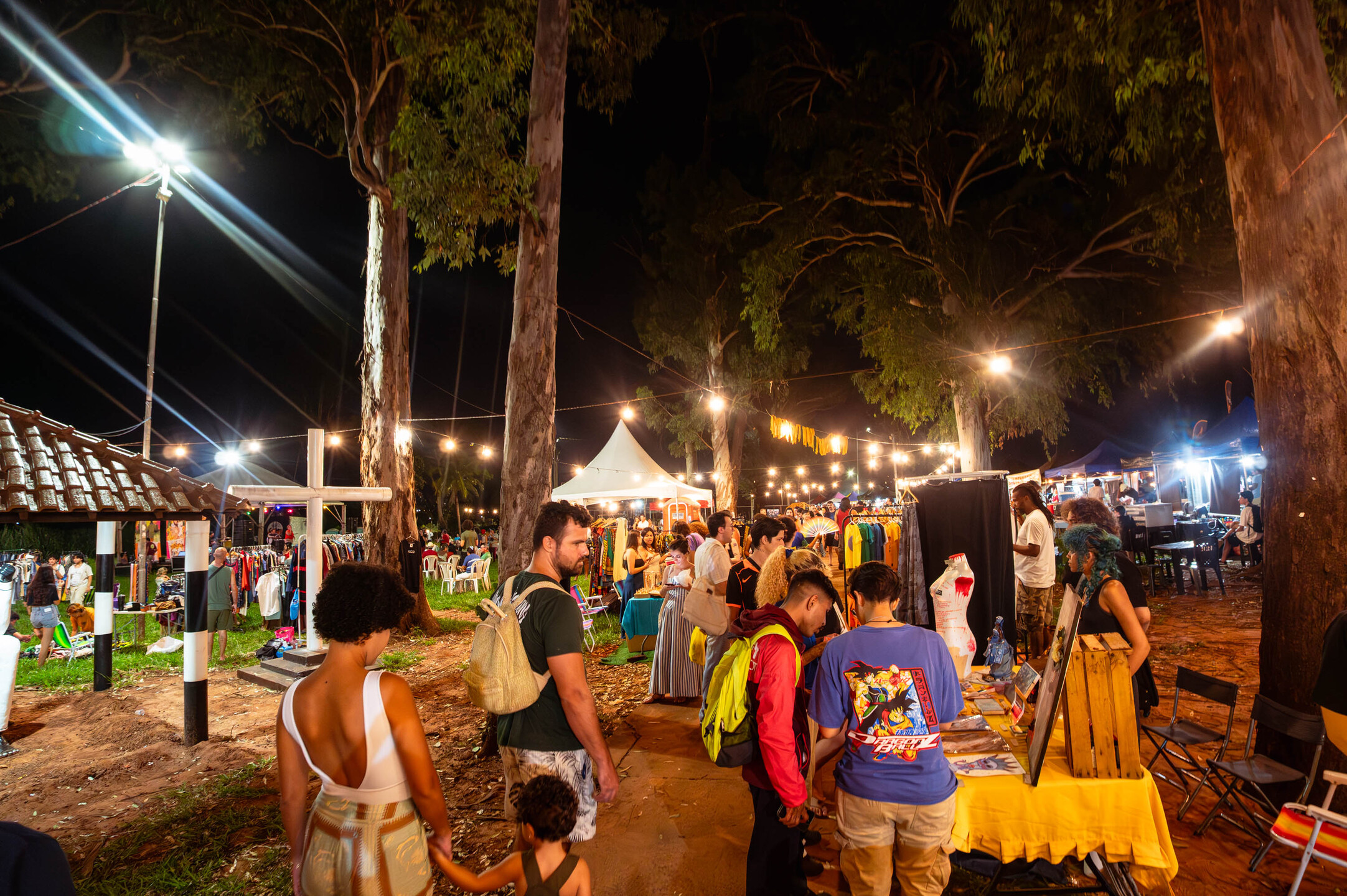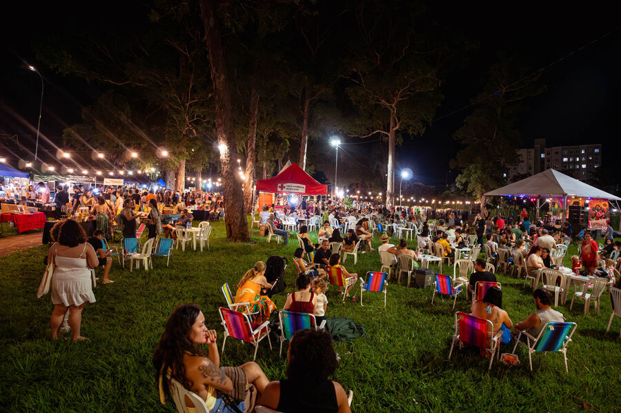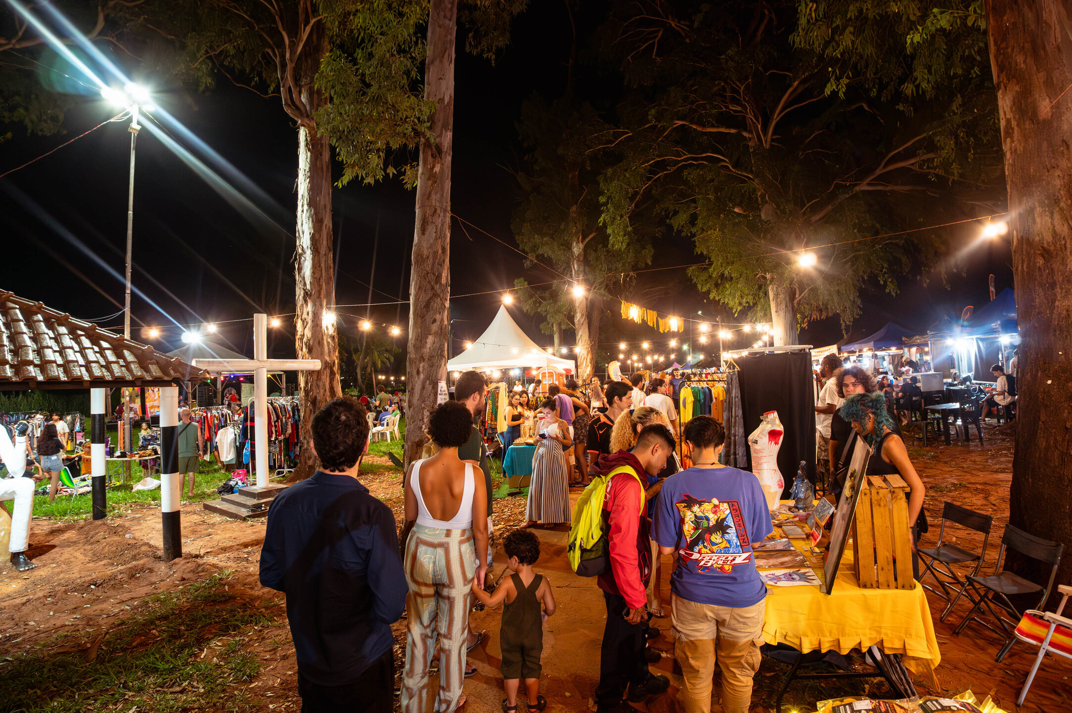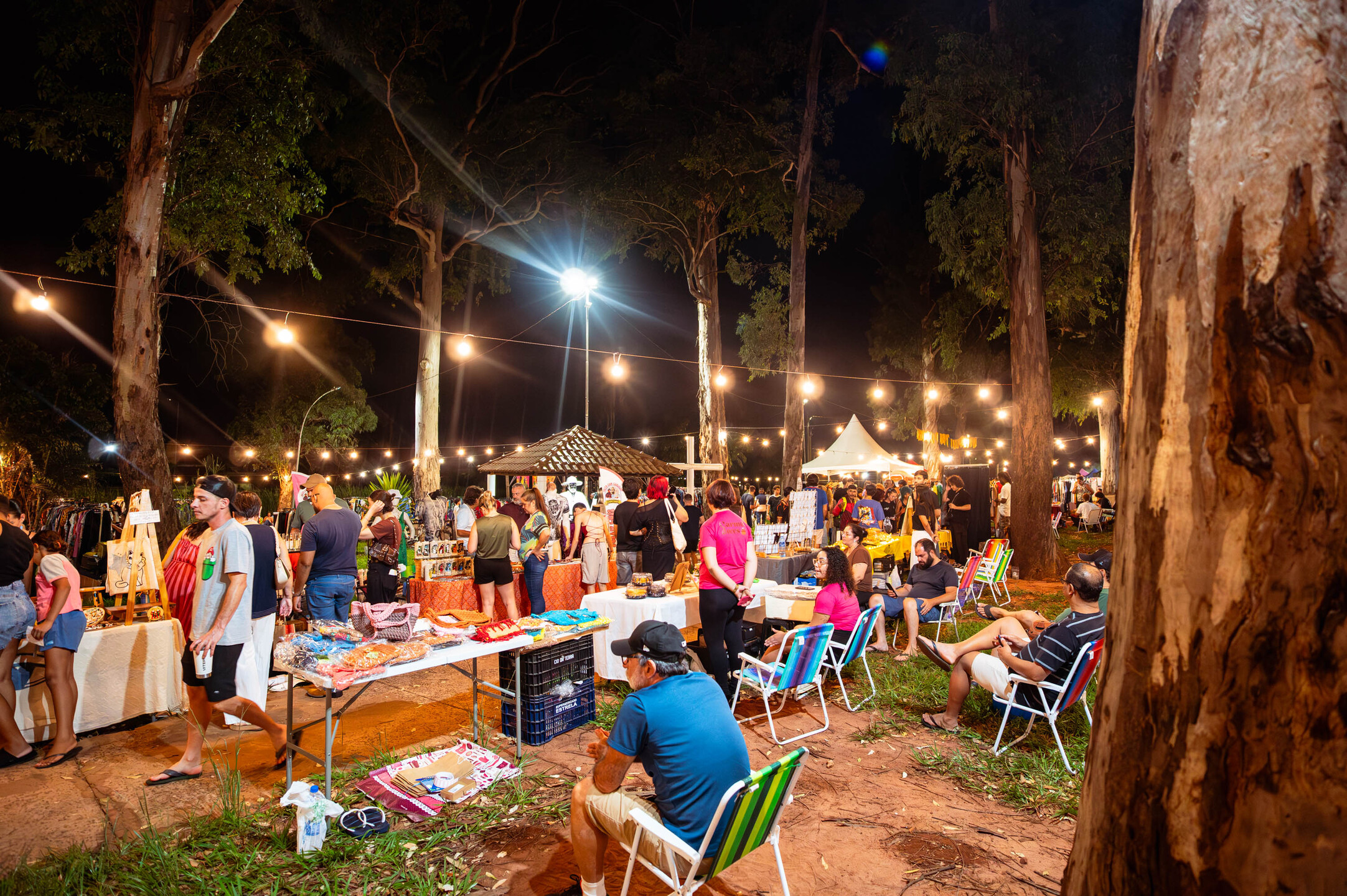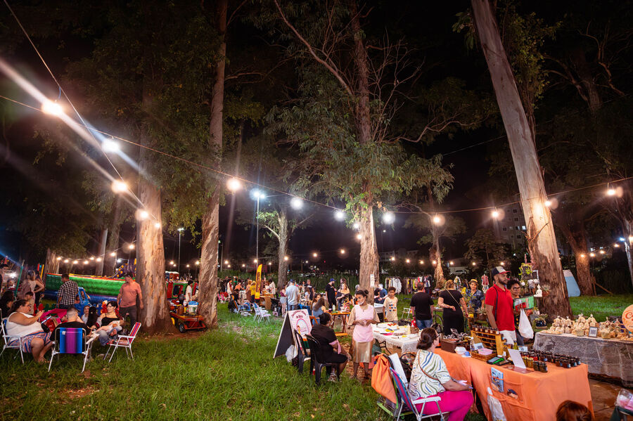 Vimos ocupados por barracas e grande público os quase 20 mil metros quadrados da área verde e passarelas da Praça do Preto Velho, no Jardim Paulista, em Campo Grande (MS). É noite de 7 de março — véspera do Dia Internacional das Mulheres — e acontece na praça a 31ª edição da Feira Ziriguidum.