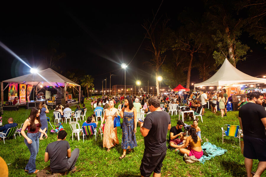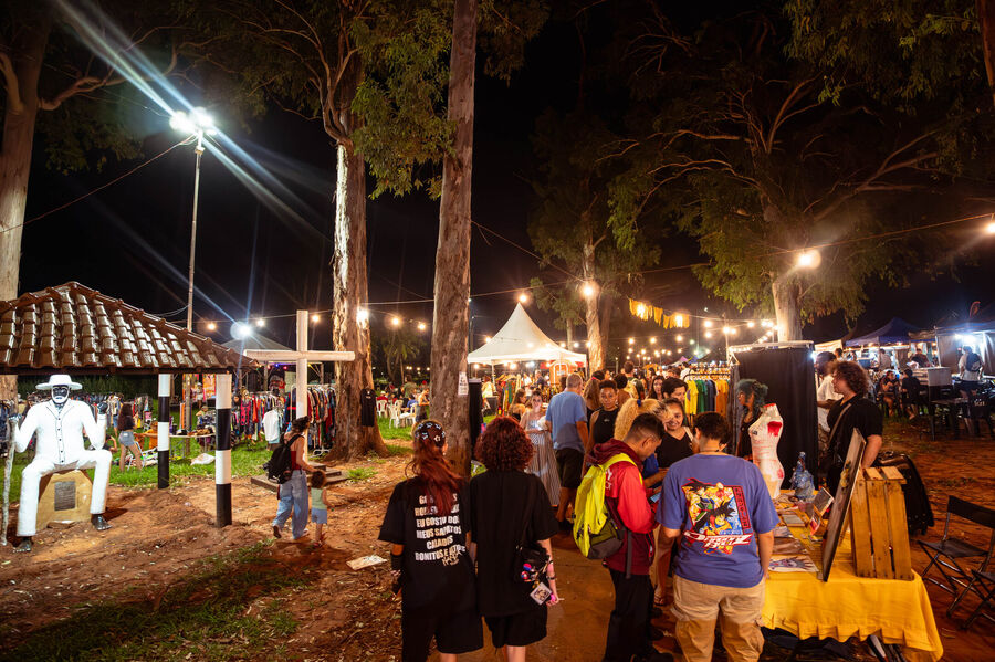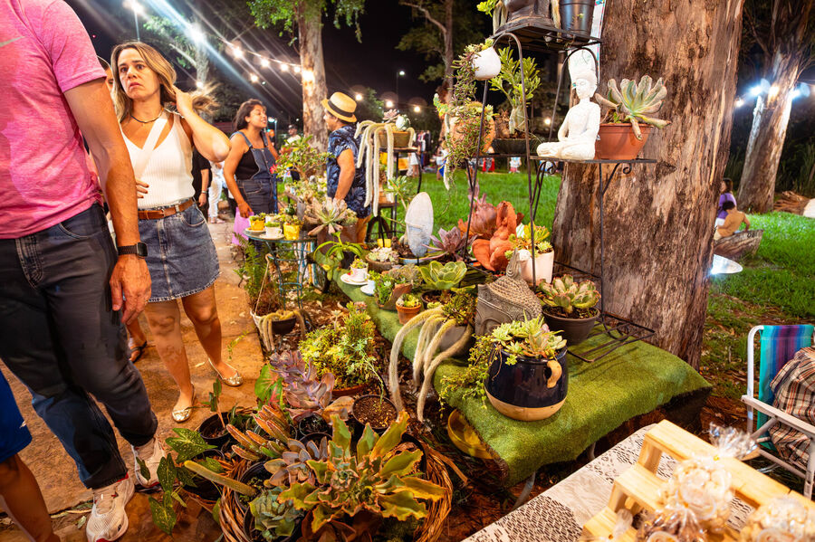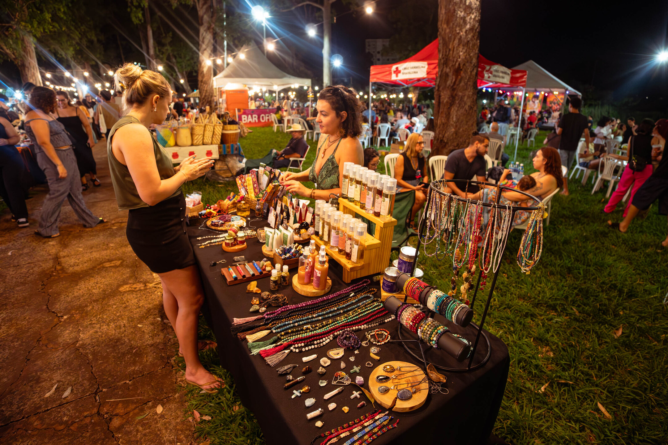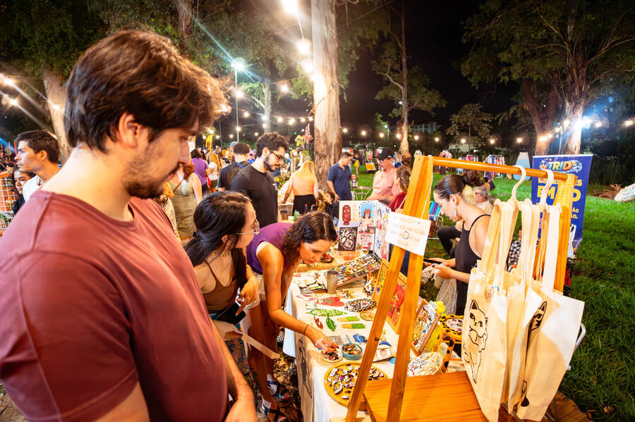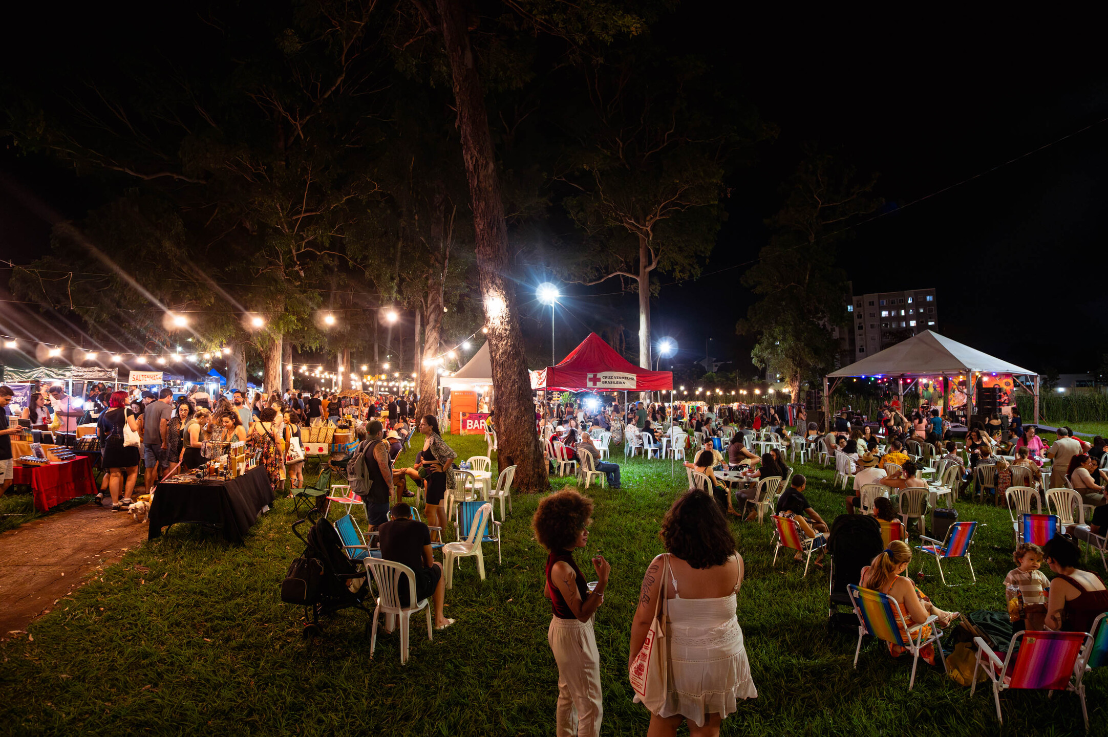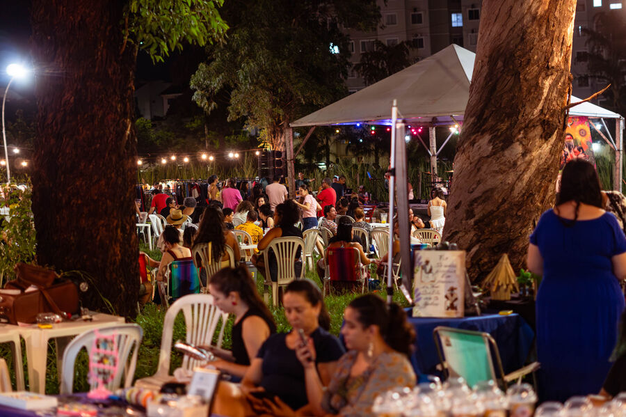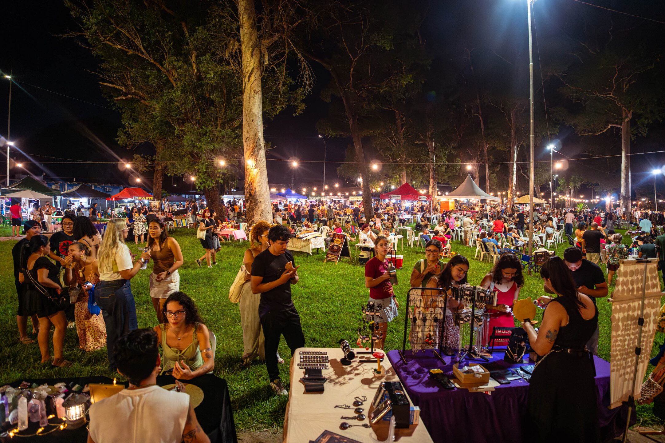 Vimos ocupados por barracas e grande público os quase 20 mil metros quadrados da área verde e passarelas da Praça do Preto Velho, no Jardim Paulista, em Campo Grande (MS). É noite de 7 de março — véspera do Dia Internacional das Mulheres — e acontece na praça a 31ª edição da Feira Ziriguidum.