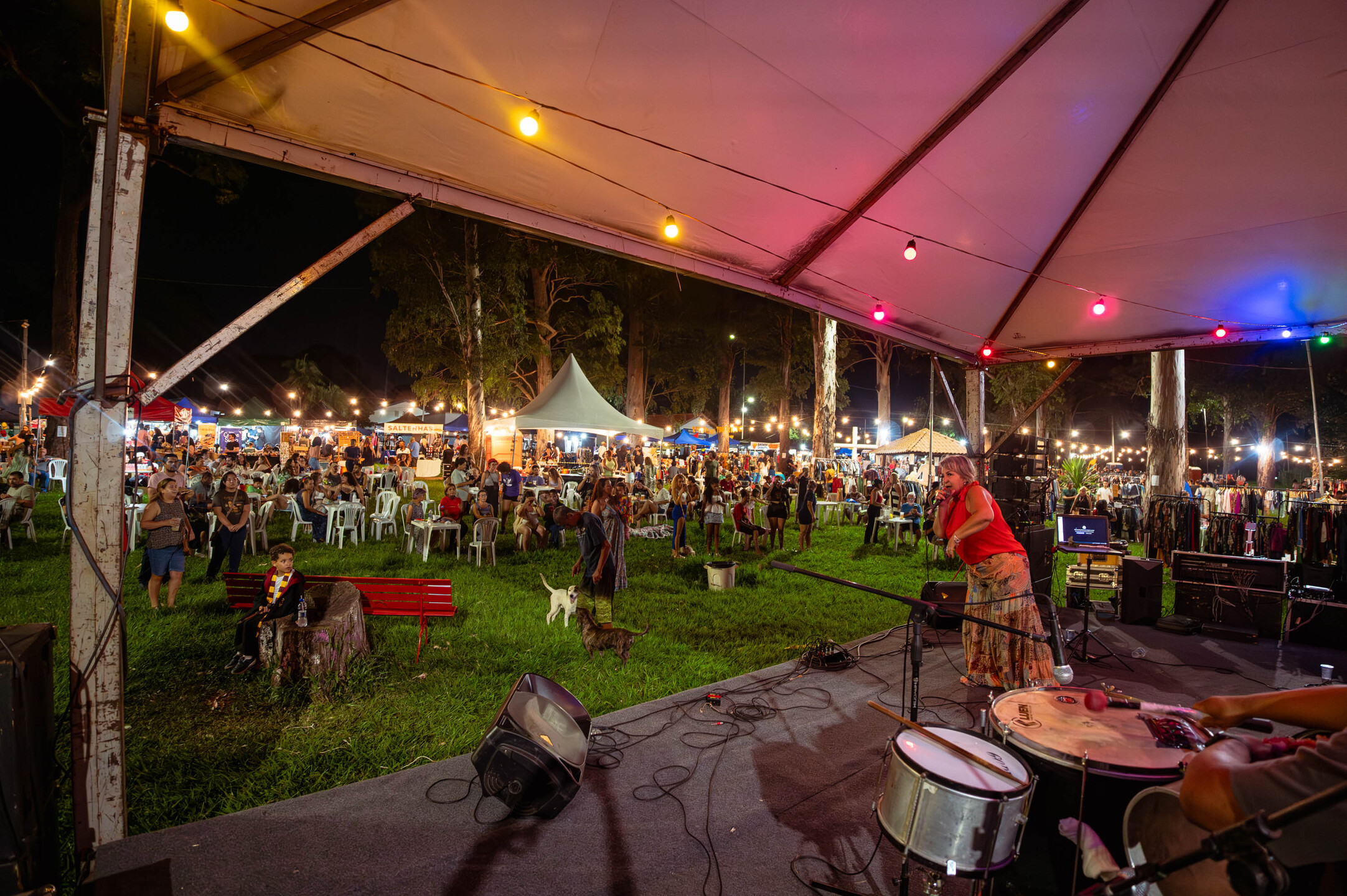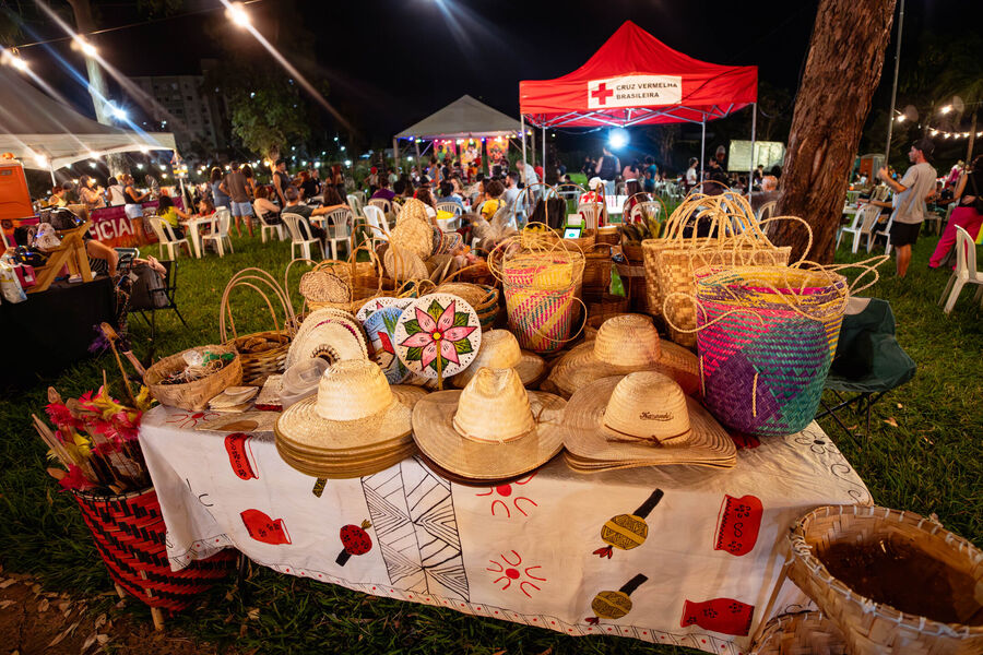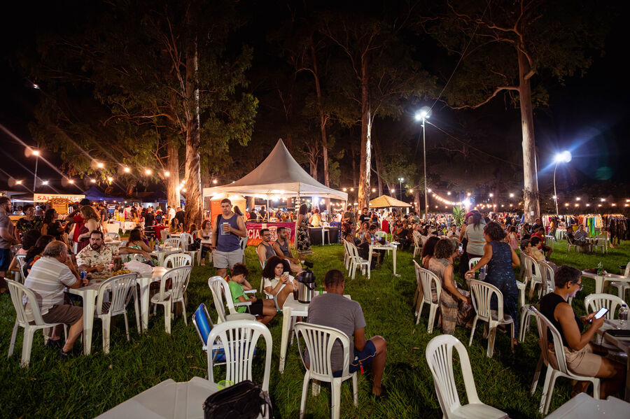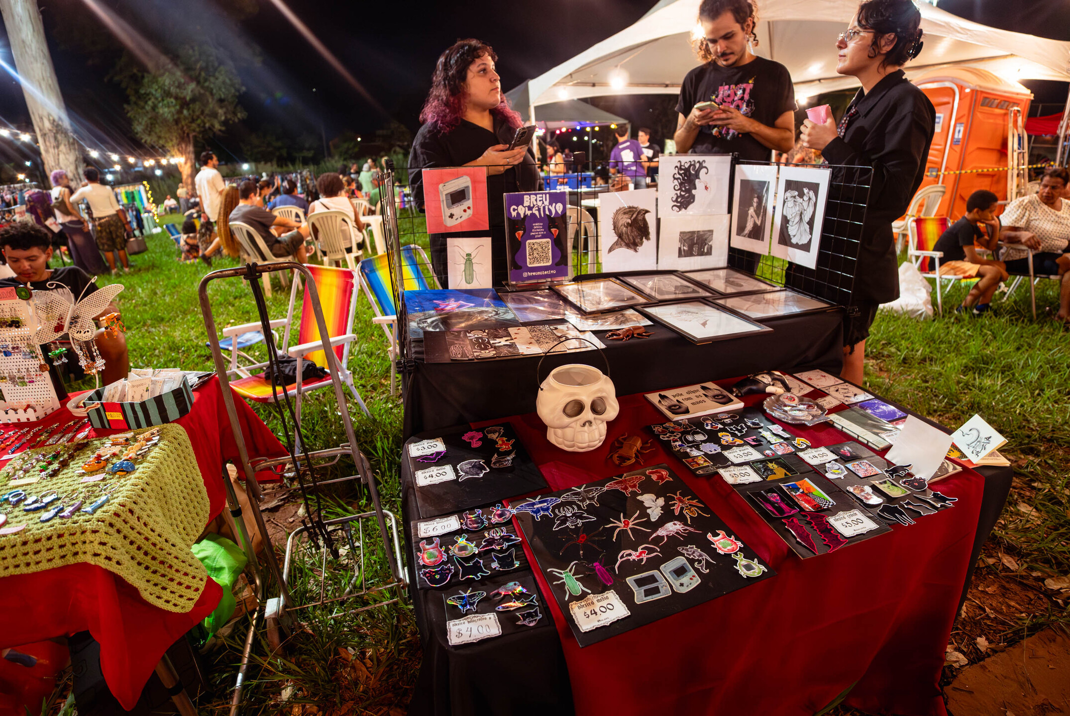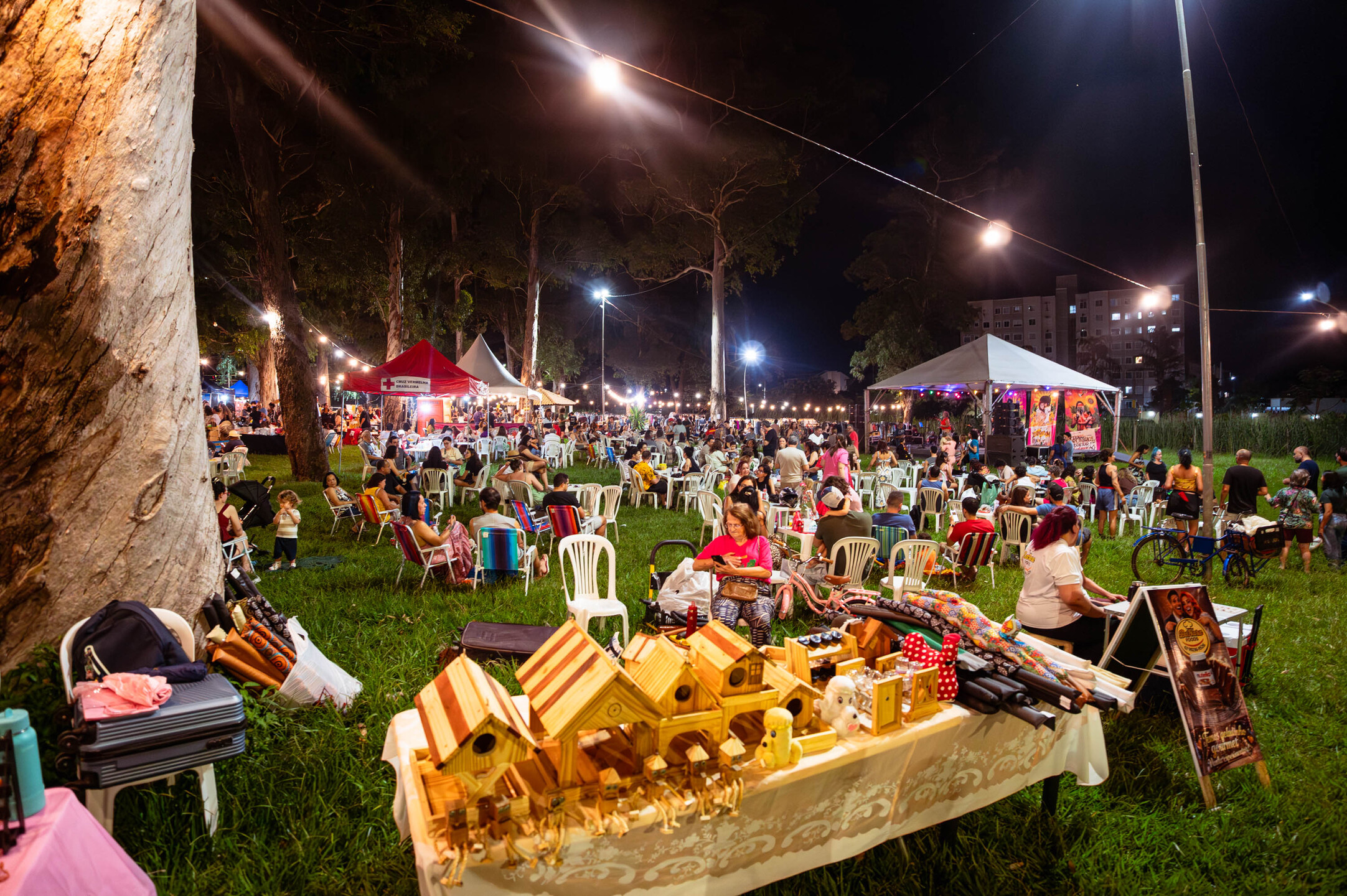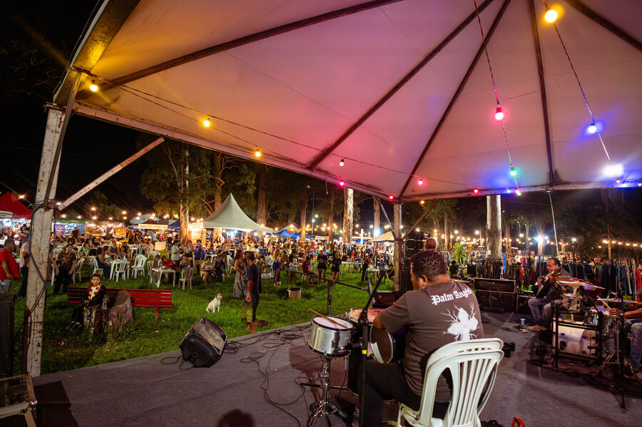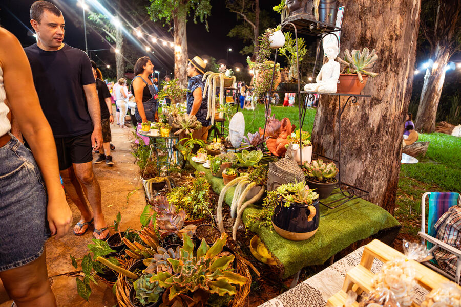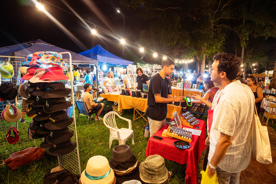 Vimos ocupados por barracas e grande público os quase 20 mil metros quadrados da área verde e passarelas da Praça do Preto Velho, no Jardim Paulista, em Campo Grande (MS). É noite de 7 de março — véspera do Dia Internacional das Mulheres — e acontece na praça a 31ª edição da Feira Ziriguidum.
