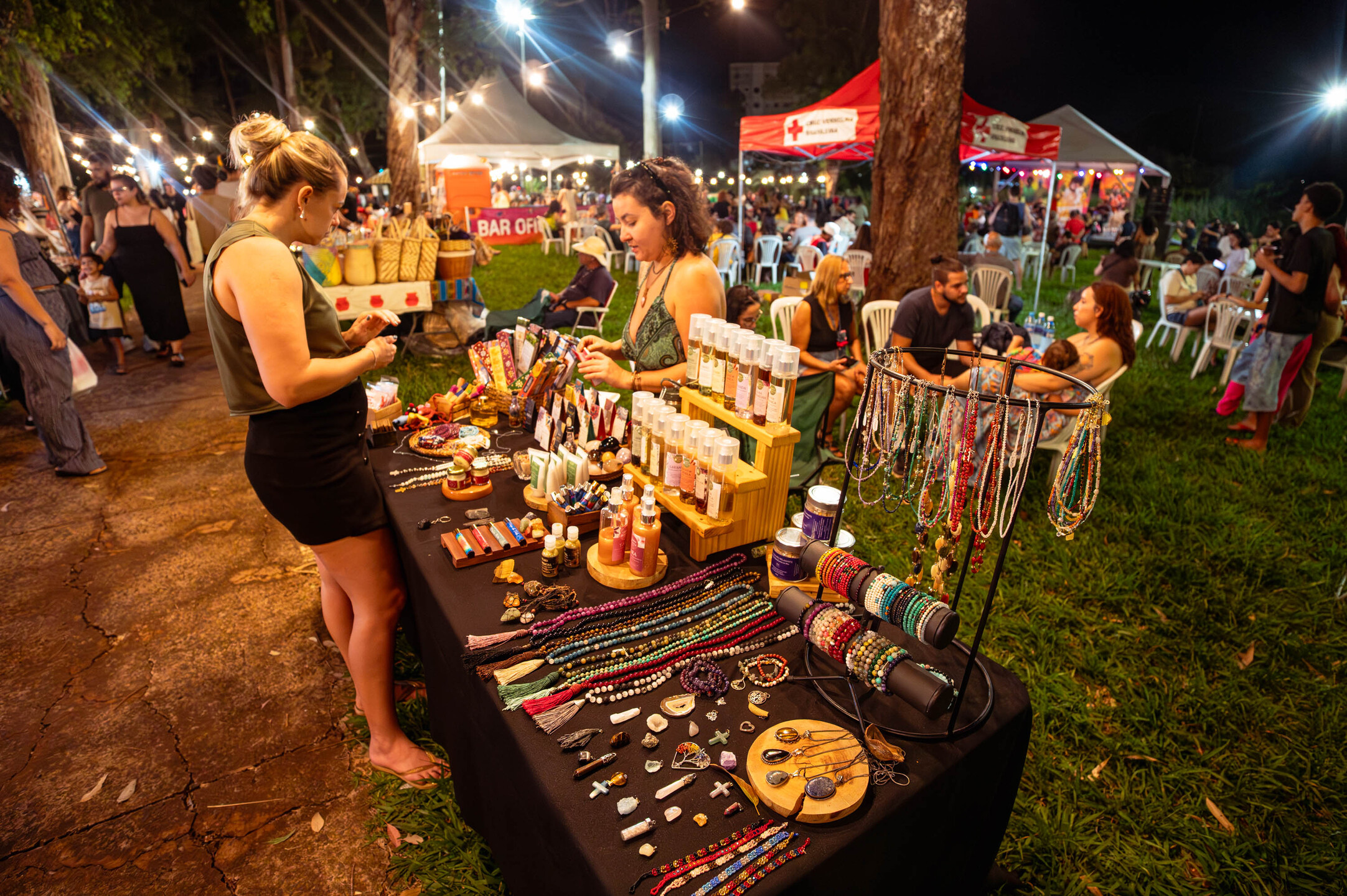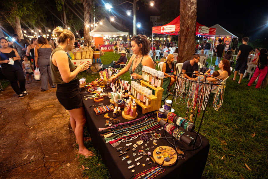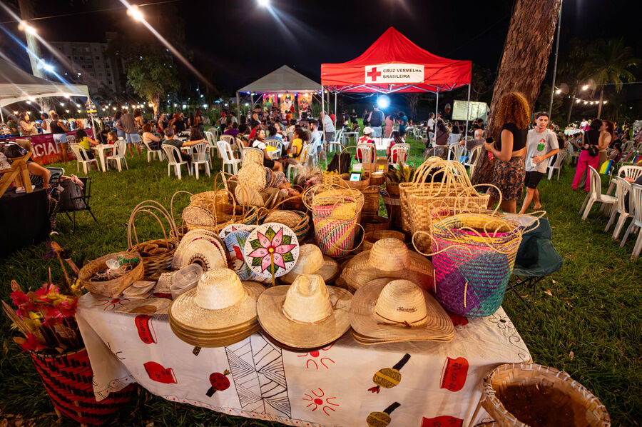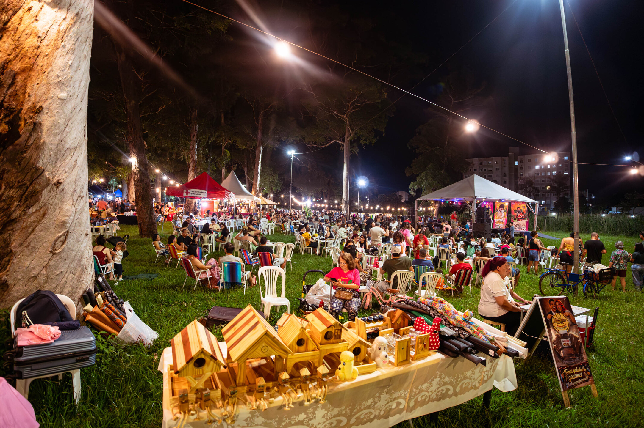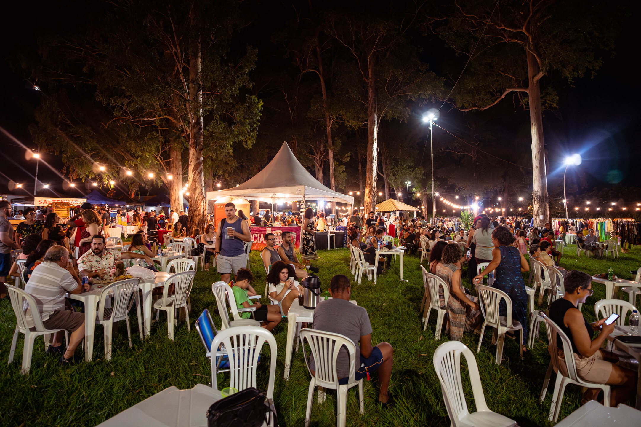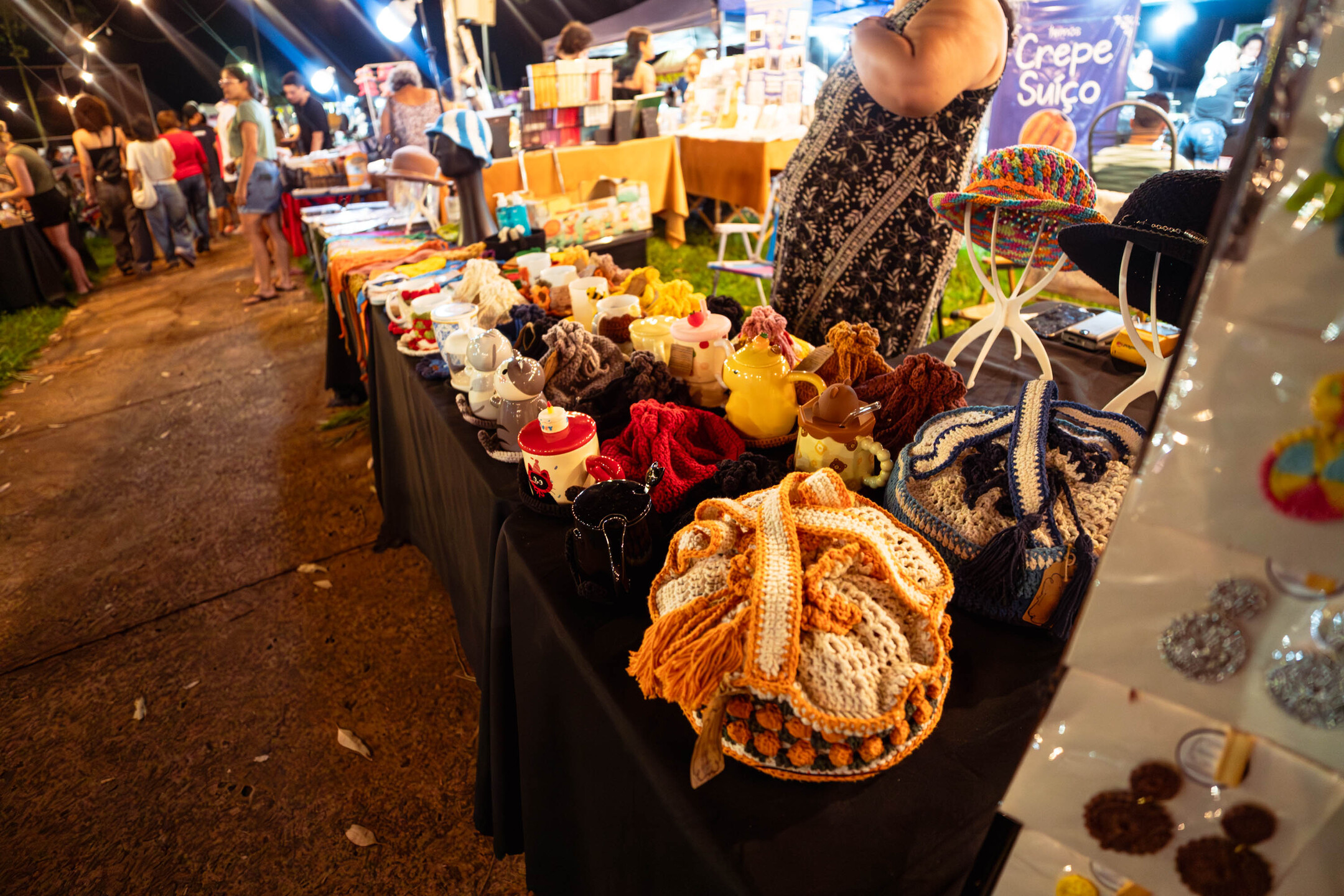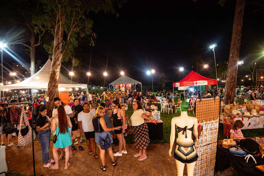 Vimos ocupados por barracas e grande público os quase 20 mil metros quadrados da área verde e passarelas da Praça do Preto Velho, no Jardim Paulista, em Campo Grande (MS). É noite de 7 de março — véspera do Dia Internacional das Mulheres — e acontece na praça a 31ª edição da Feira Ziriguidum.