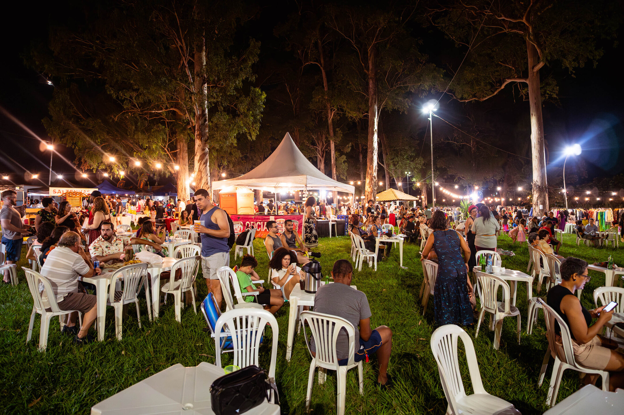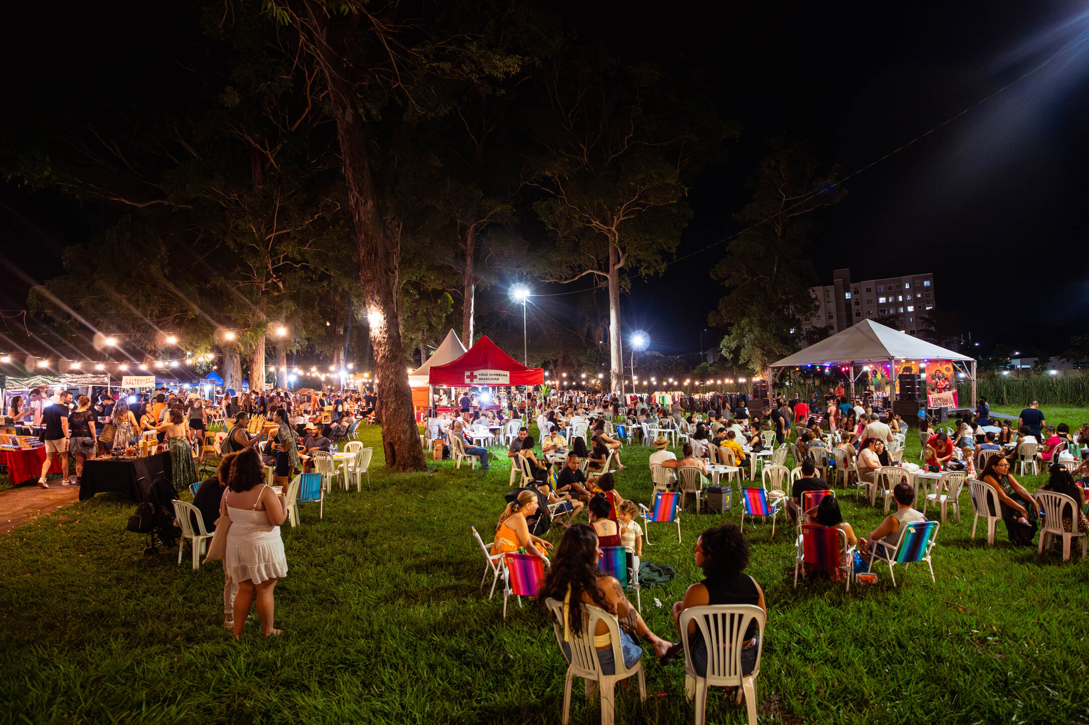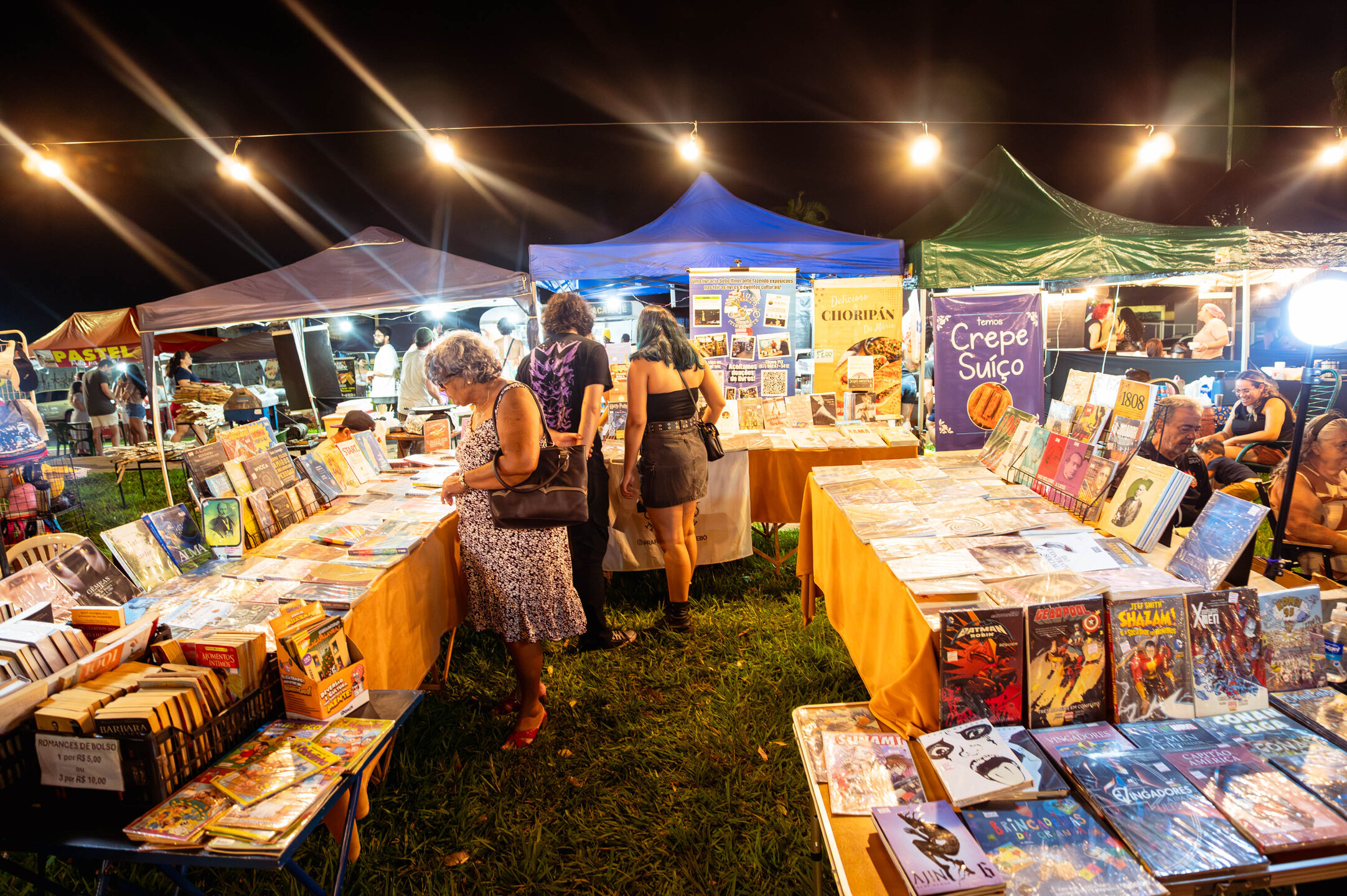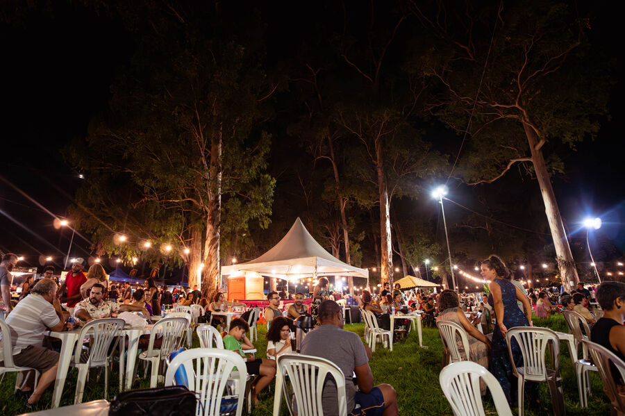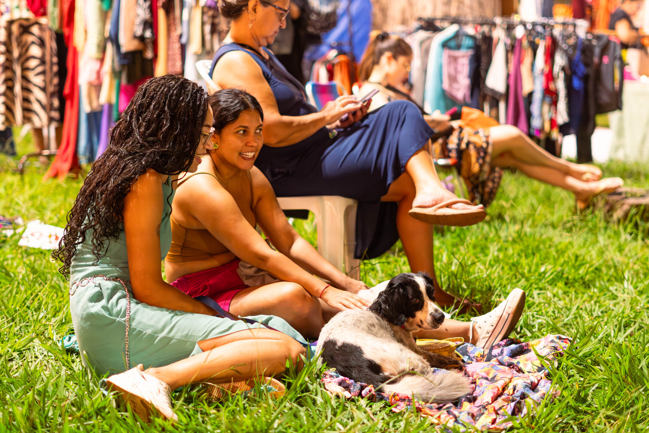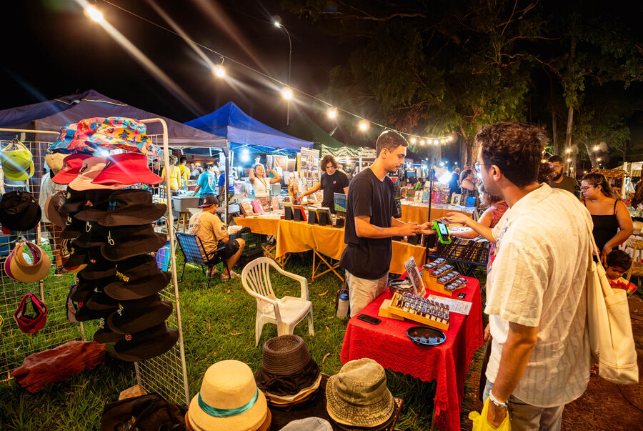 Vimos ocupados por barracas e grande público os quase 20 mil metros quadrados da área verde e passarelas da Praça do Preto Velho, no Jardim Paulista, em Campo Grande (MS). É noite de 7 de março — véspera do Dia Internacional das Mulheres — e acontece na praça a 31ª edição da Feira Ziriguidum.
