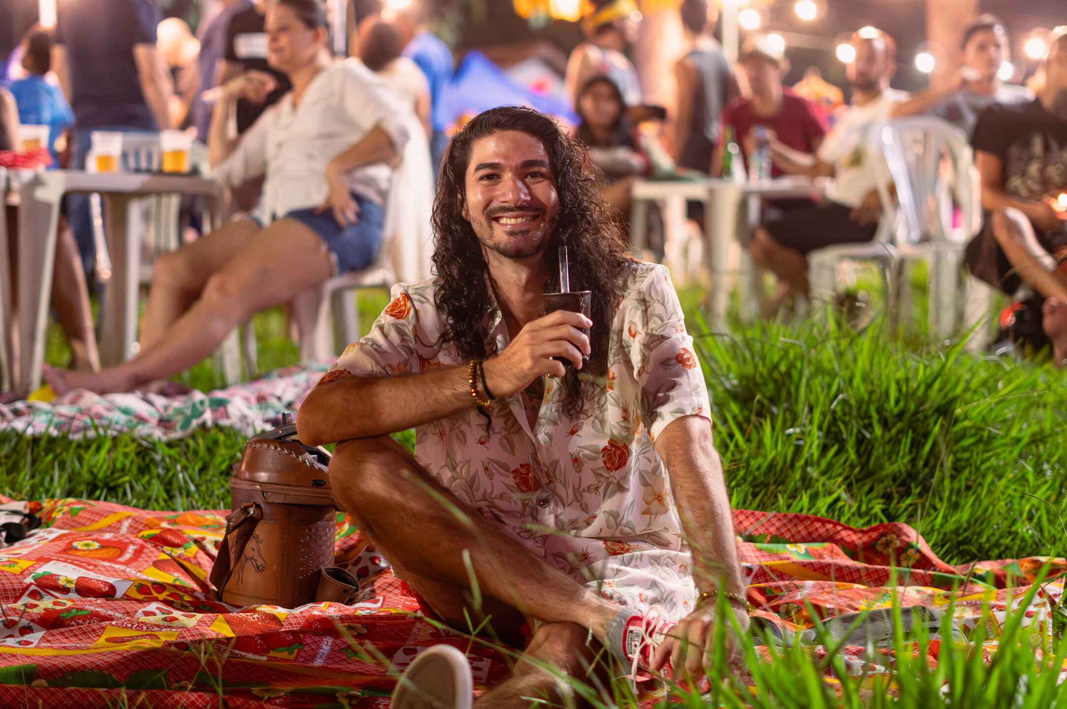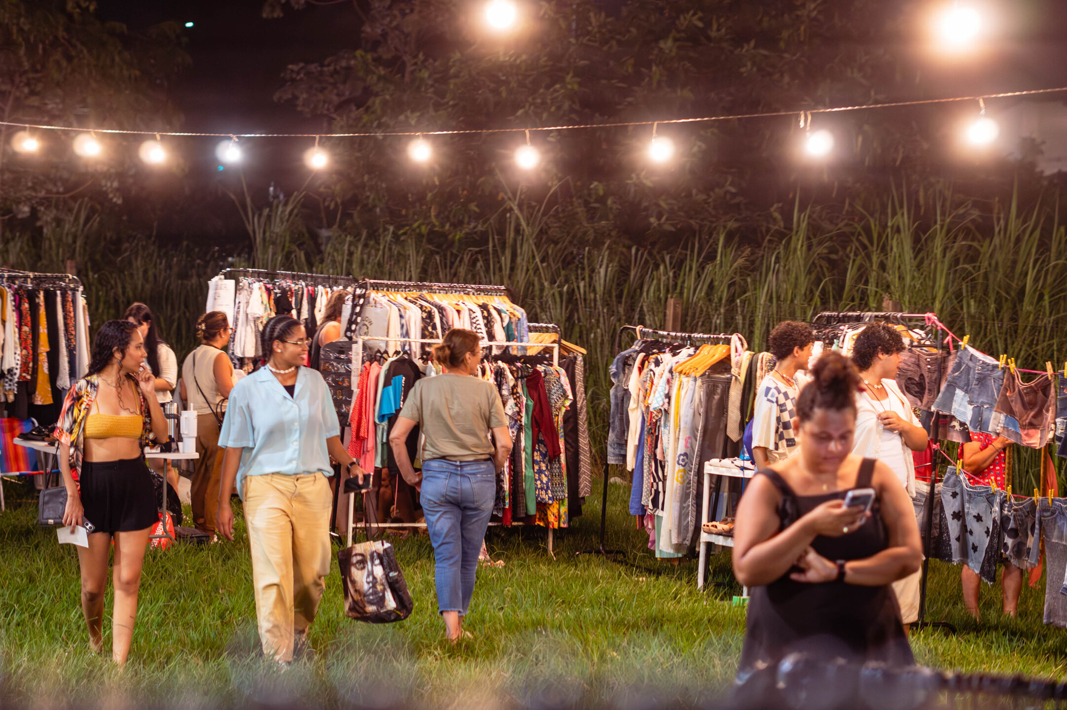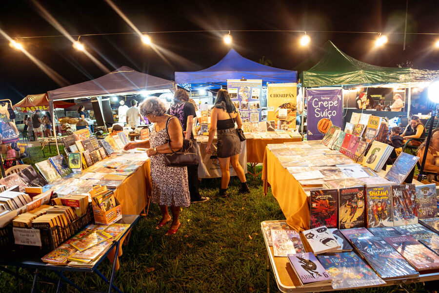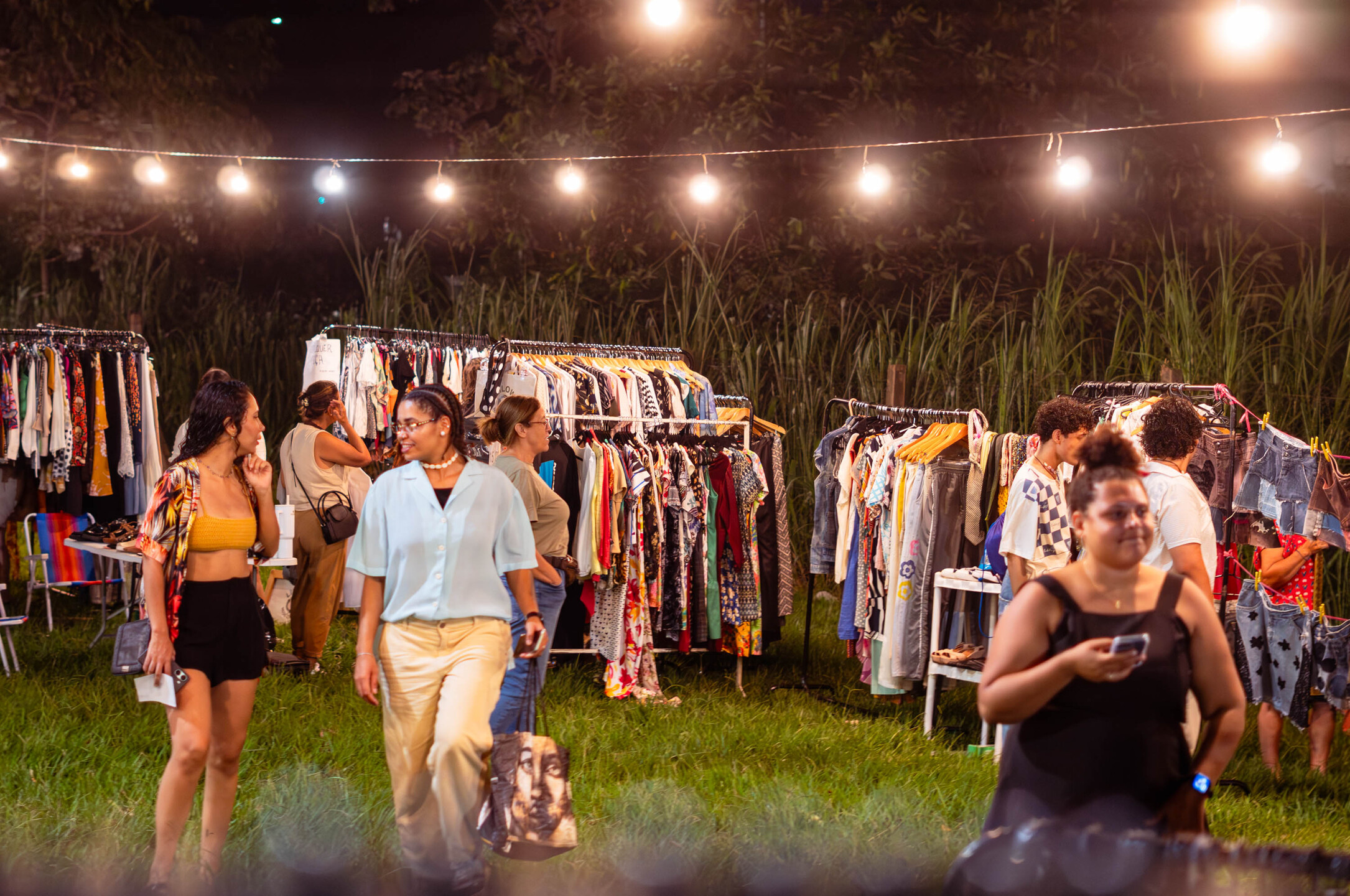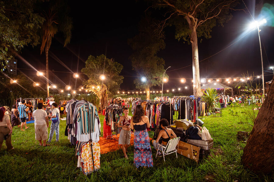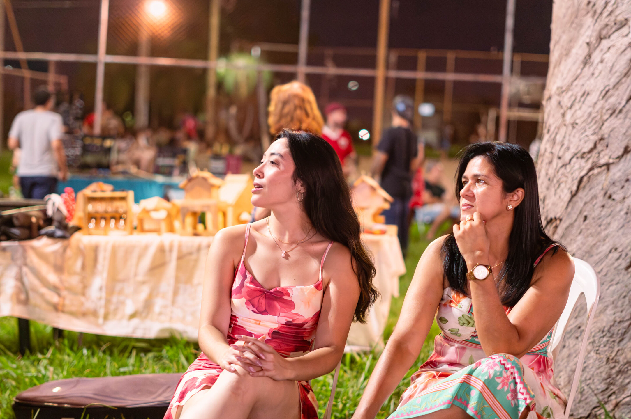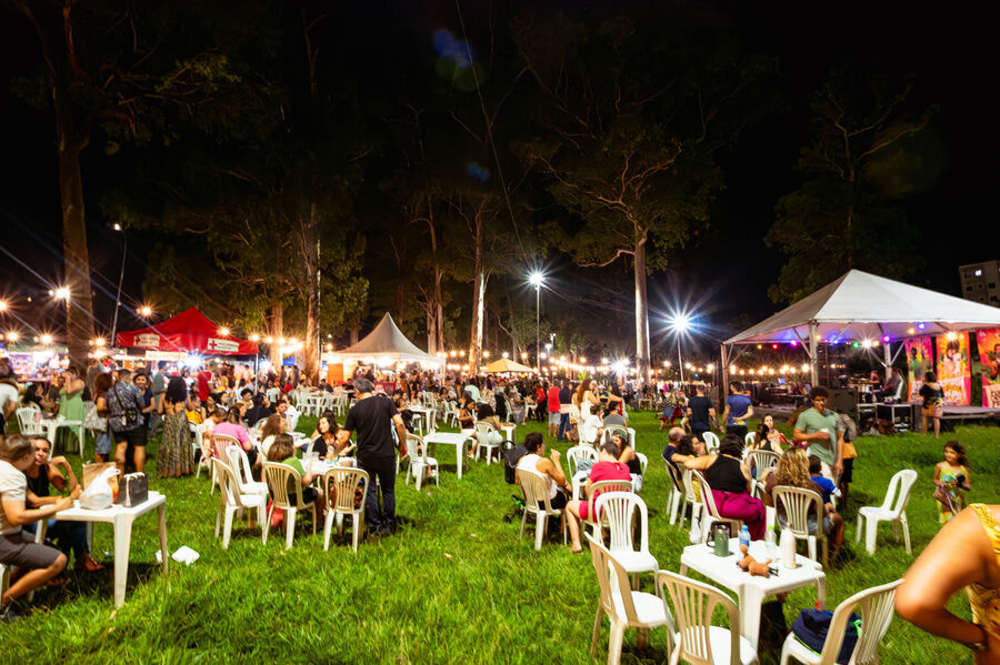 Vimos ocupados por barracas e grande público os quase 20 mil metros quadrados da área verde e passarelas da Praça do Preto Velho, no Jardim Paulista, em Campo Grande (MS). É noite de 7 de março — véspera do Dia Internacional das Mulheres — e acontece na praça a 31ª edição da Feira Ziriguidum.