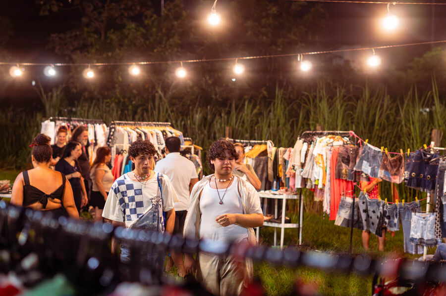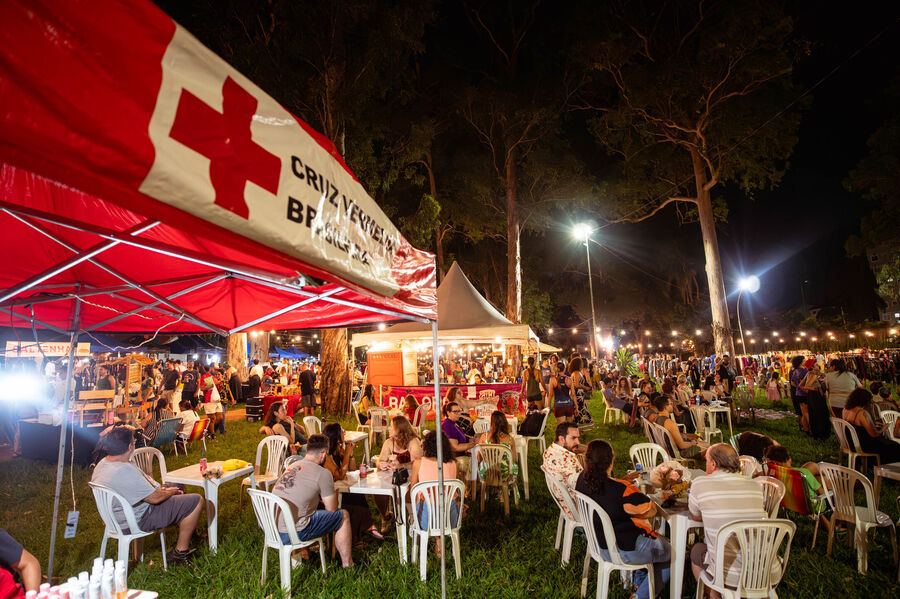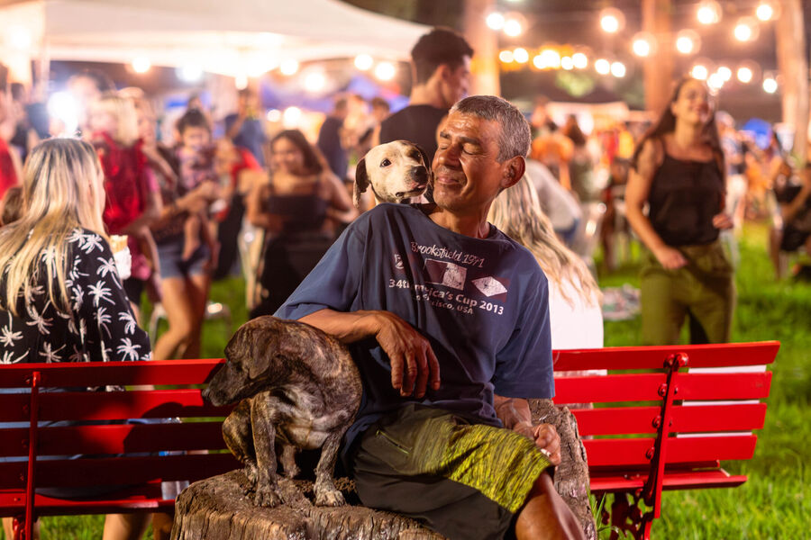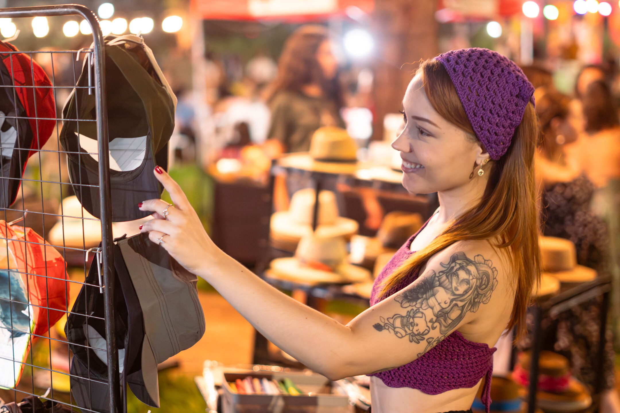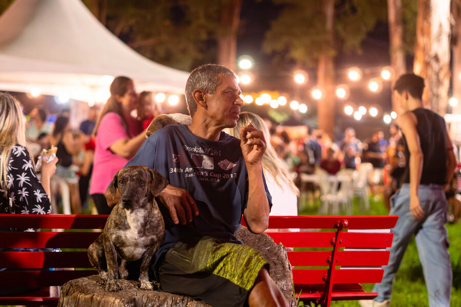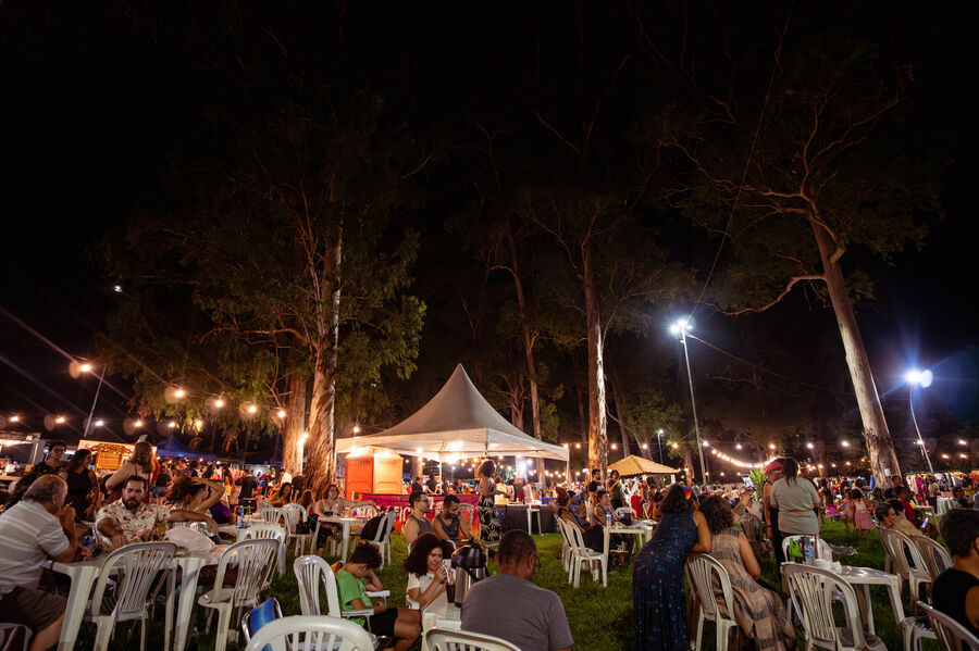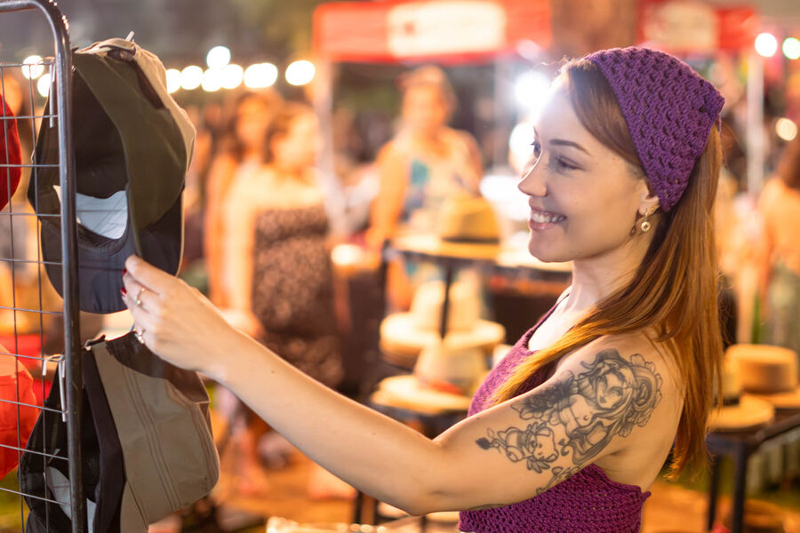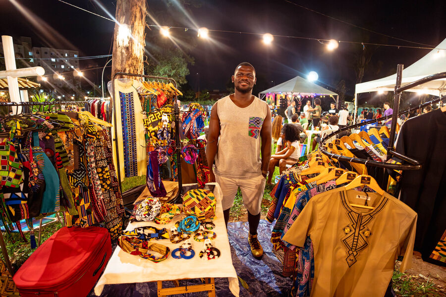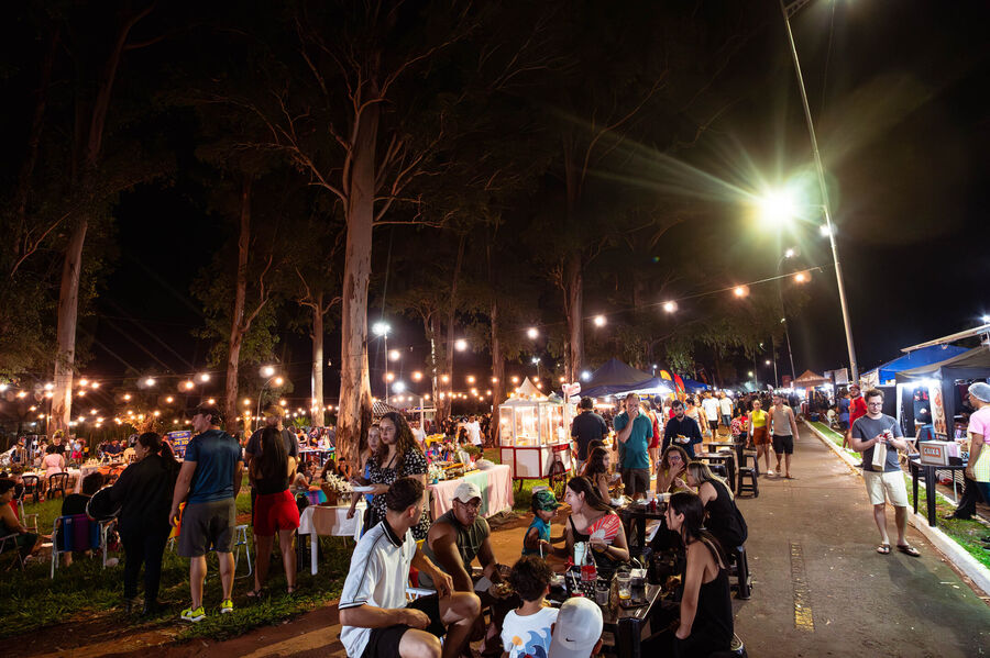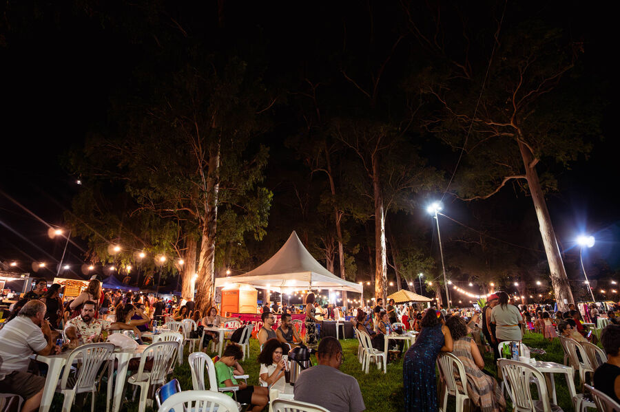 Vimos ocupados por barracas e grande público os quase 20 mil metros quadrados da área verde e passarelas da Praça do Preto Velho, no Jardim Paulista, em Campo Grande (MS). É noite de 7 de março — véspera do Dia Internacional das Mulheres — e acontece na praça a 31ª edição da Feira Ziriguidum.