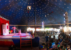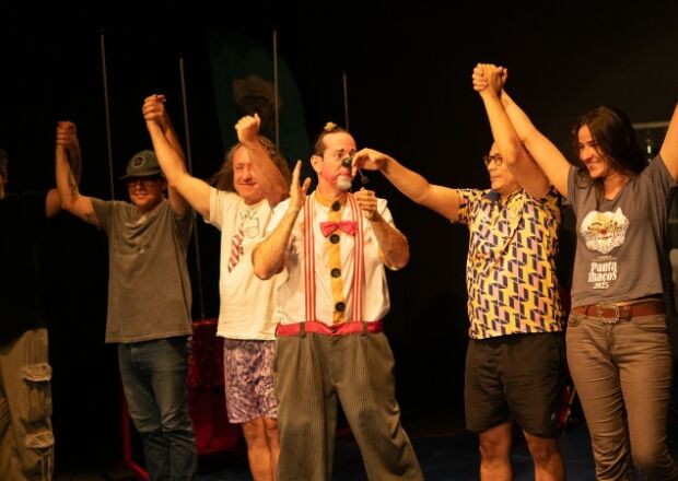 Sob chuva forte, palhaço de SP arrasta público para a Orla e ao Teatro
