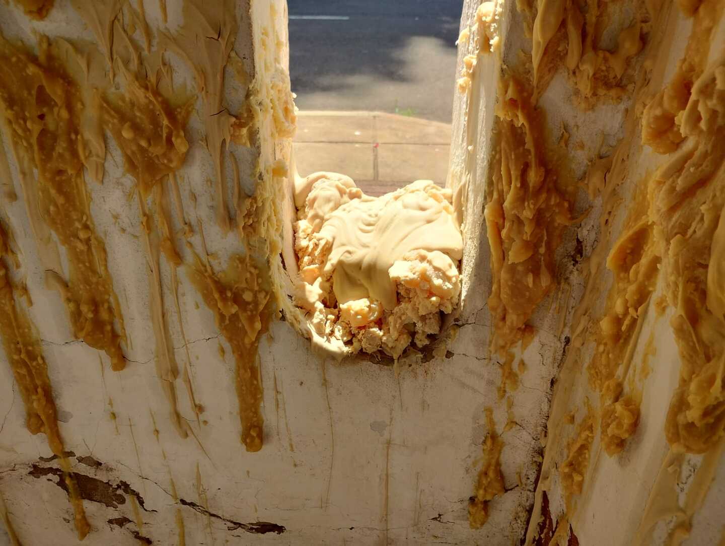 A proposta do artista, alinhada ao conceito do evento, utilizou materiais que acabaram por manchar as paredes do edifício histórico.
