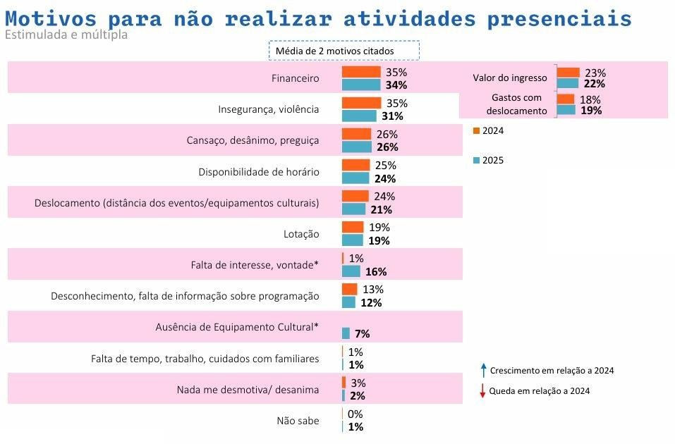 A pesquisa também mostra que barreiras financeiras e de segurança afastam cerca de 30% dos brasileiros de atividades culturais presenciais.