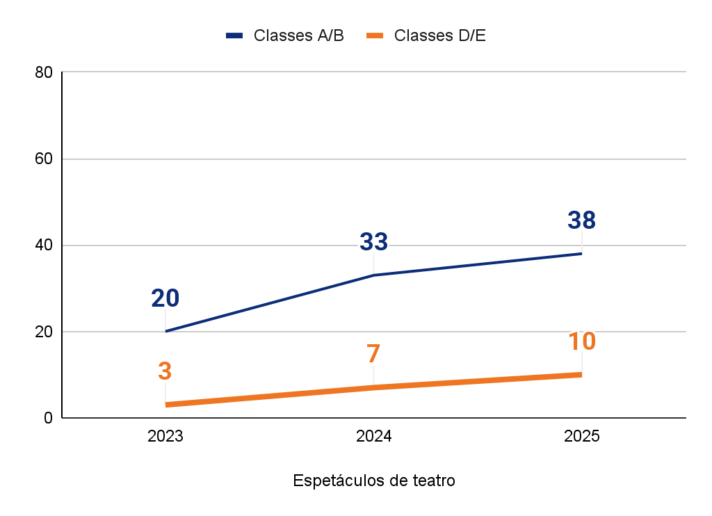 Mesmo com o aumento do acesso, a série histórica da pesquisa mostra que a diferença entre classes sociais se mantém estável. Por exemplo, o acesso ao cinema entre classes A/B e D/E ainda tem diferença de cerca de 40 pontos percentuais.
