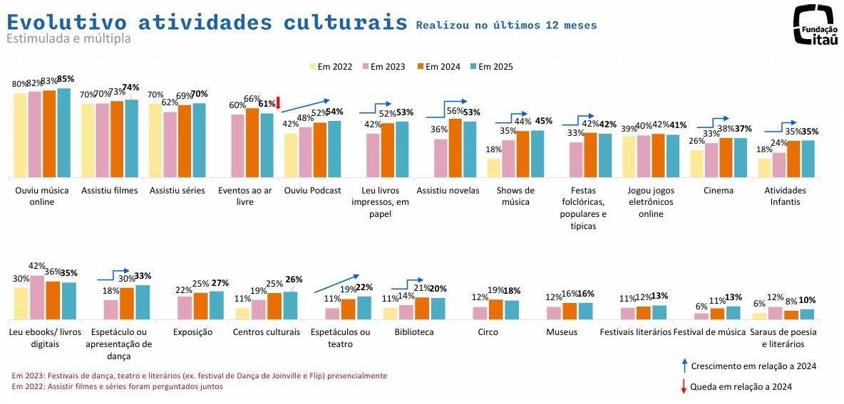 O consumo de cultura pelos meios digitais disparou no Brasil: 90% dos brasileiros participaram de alguma atividade cultural online nos últimos 12 meses, segundo a 6ª edição da pesquisa Hábitos Culturais, do Observatório Fundação Itaú, com apoio técnico do Datafolha, divulgado nesta 3ª feira (11.nov.25).