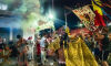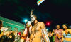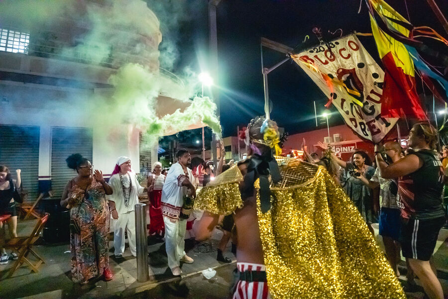 (12.fev.26) - Val Eloy porta estandarte do Bloco de Carnaval de Rua Voro'pi criado em 2025. Foto: Tero Queiroz Mas a "oferta" do Evoé se expandiu. O que Fernando descreveu poeticamente como a união de "povos de terreiro e o bolo de cobra", materializou-se na presença marcante do Bloco Voro'pi. A liderança indígena Val Eloy explicou a profundidade dessa aliança, que une a mitologia grega à cosmologia dos povos originários.