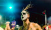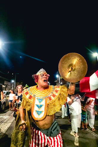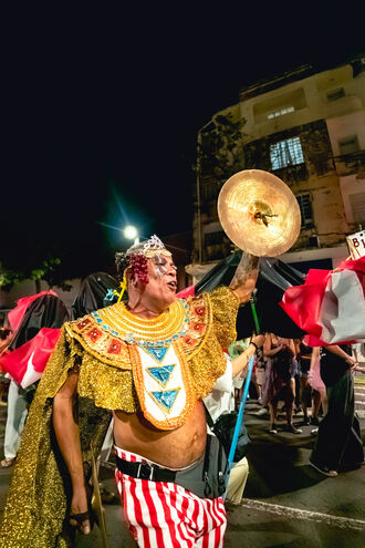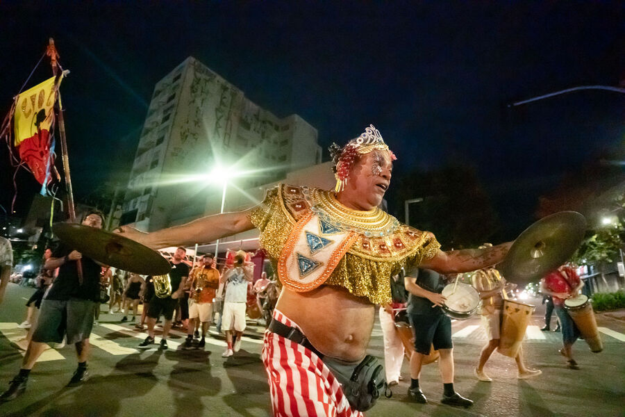(12.fev.26) - Fernando Cruz durante performance no cortejo do Bloco Carnavalesco Evoé Baco em Campo Grande (MS). Foto: Tero Queiroz "O carnaval na rua, feito por cada uma das pessoas, provoca o que chamo de 'remover a couraça'. As pessoas que muitas vezes estão duras, no corpo imposto pela sociedade, se soltam, dançam e cantam", teoriza o diretor.