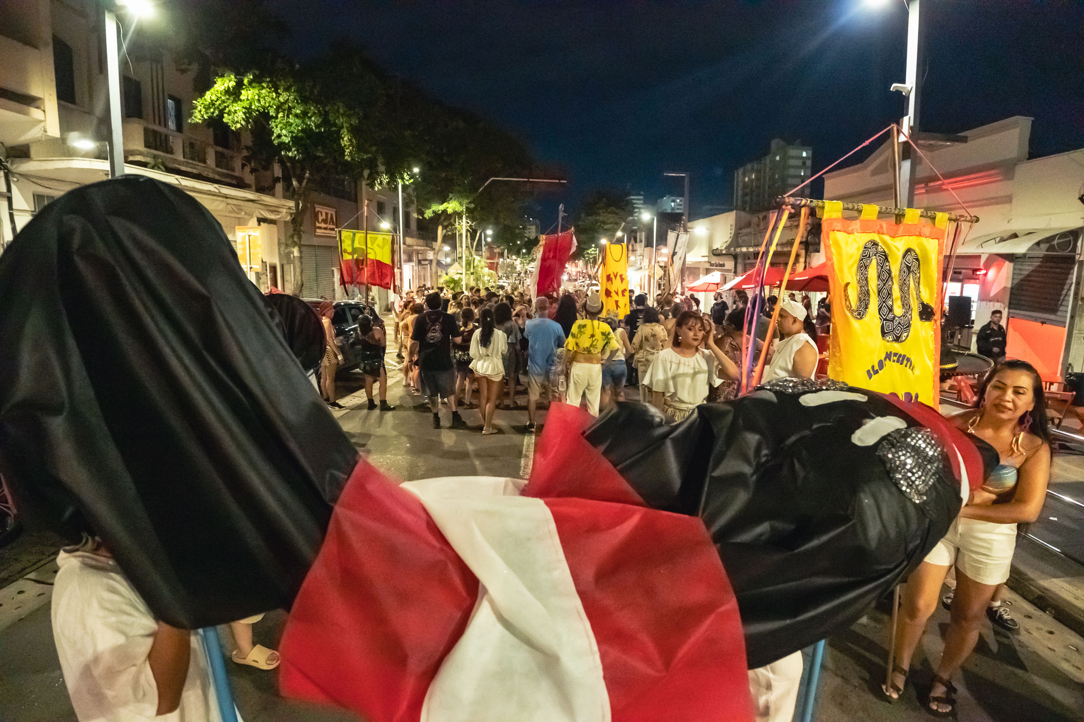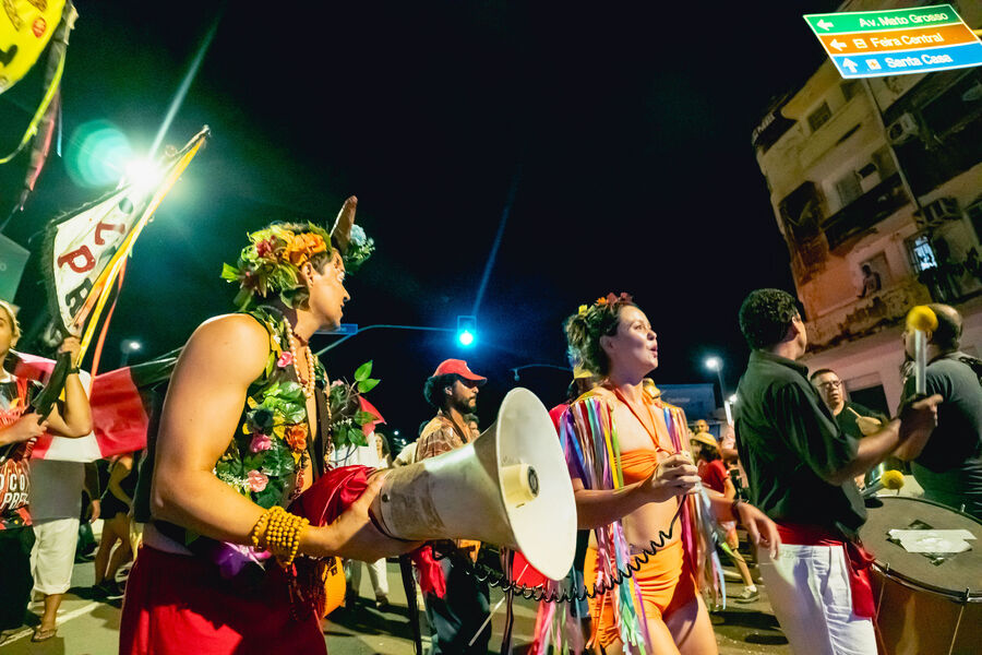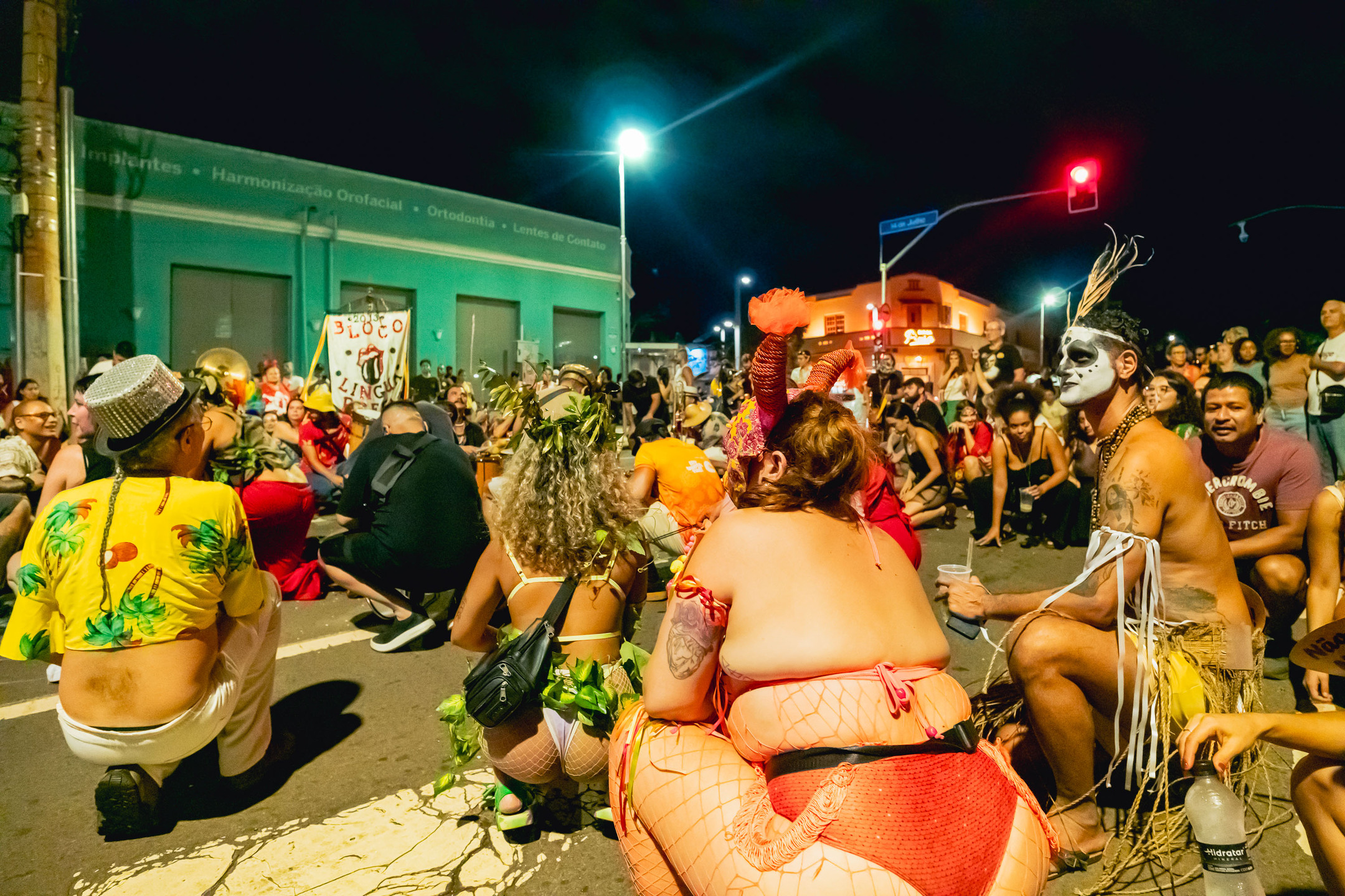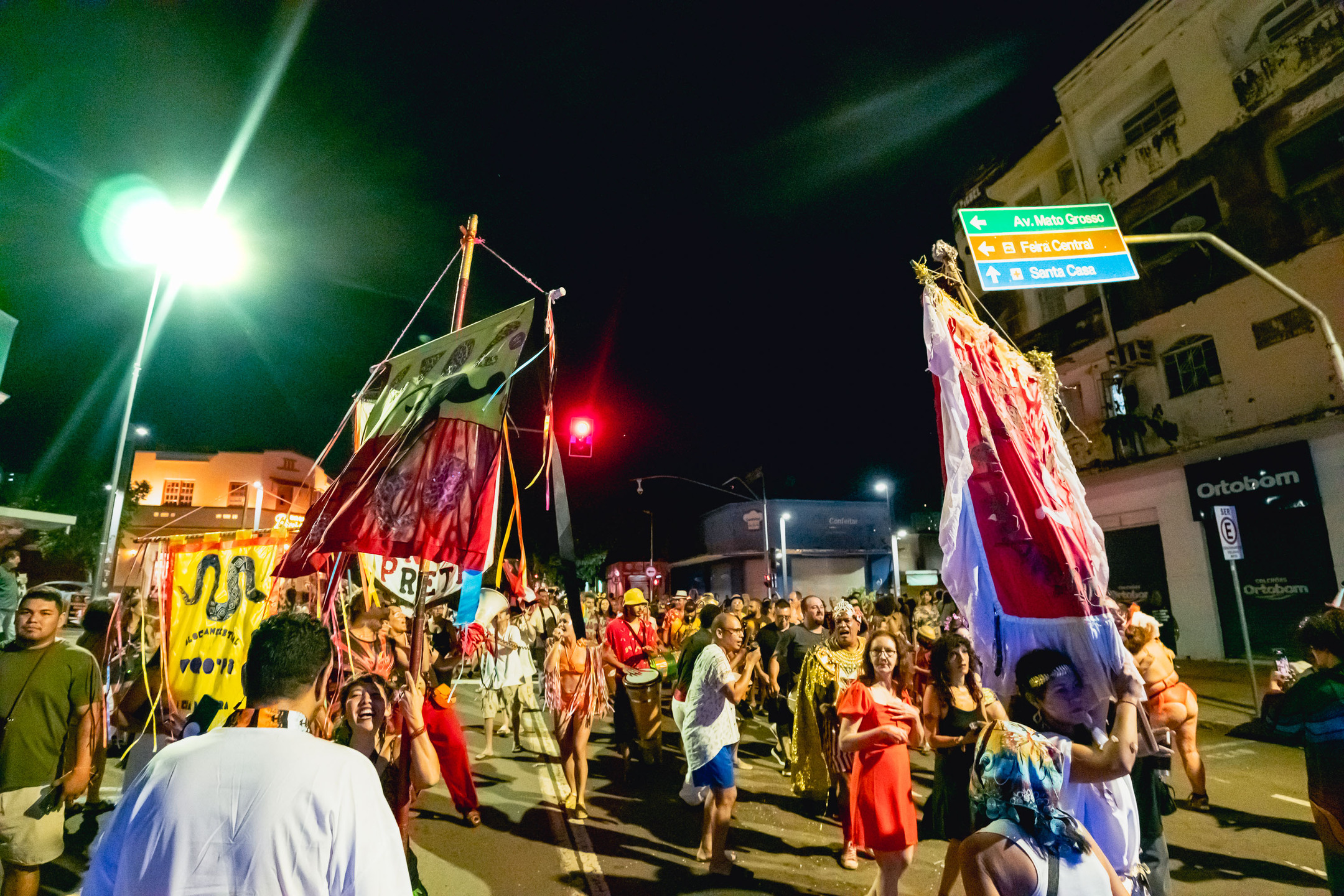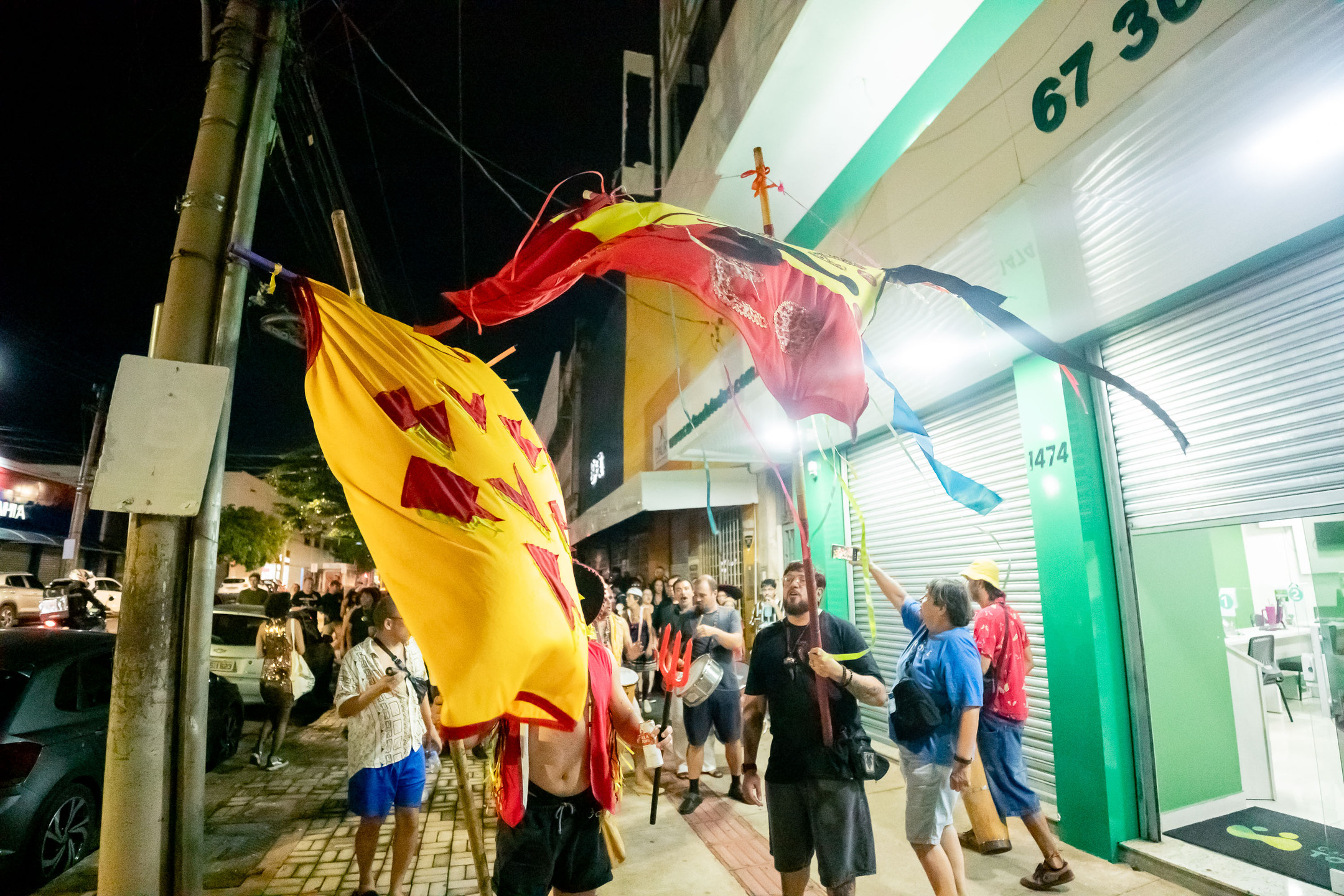 A Rua 14 de Julho, artéria pulsante do comércio e do “centro do capital” em Campo Grande (MS), teve sua lógica subvertida na noite desta 5ª feira (12.fev.26). Onde normalmente impera a pressa do trabalhador ou o fluxo do consumo, o Bloco Carnavalesco Evoé Baco, do grupo de teatro e ponto de cultura Imaginário Maracangalha, instaurou outra ordem: a do encontro.