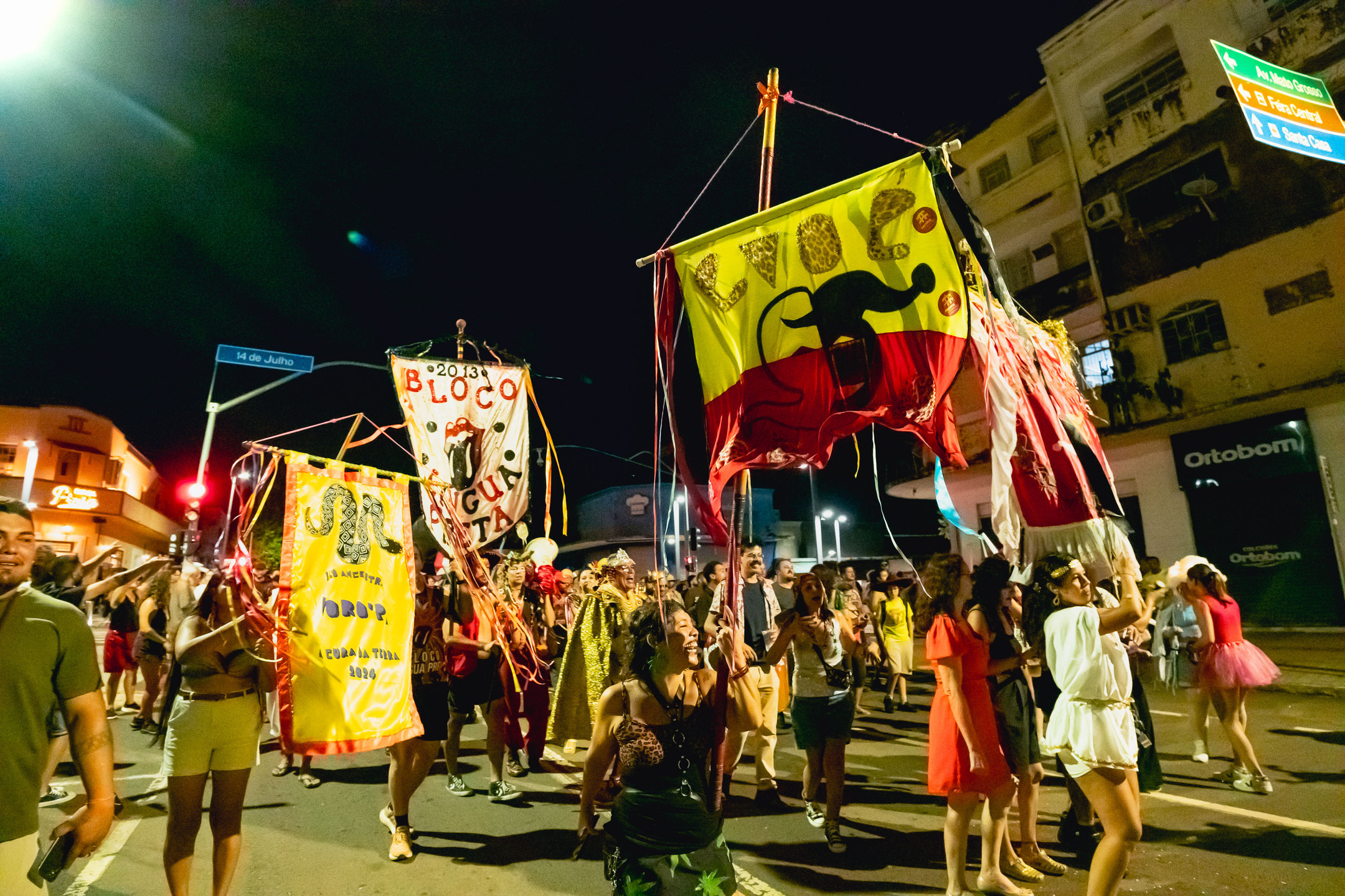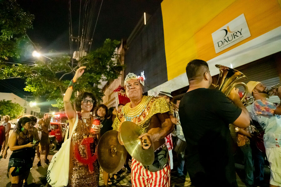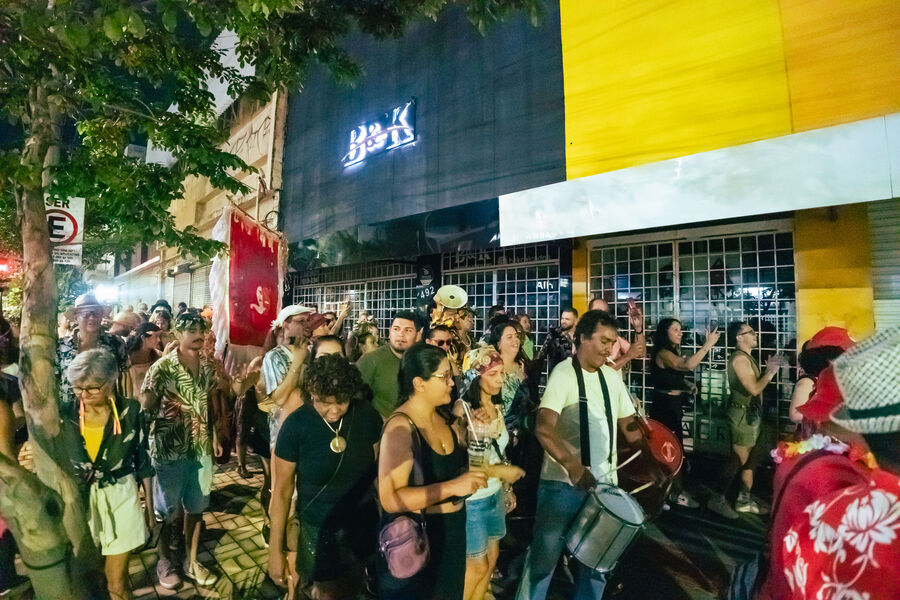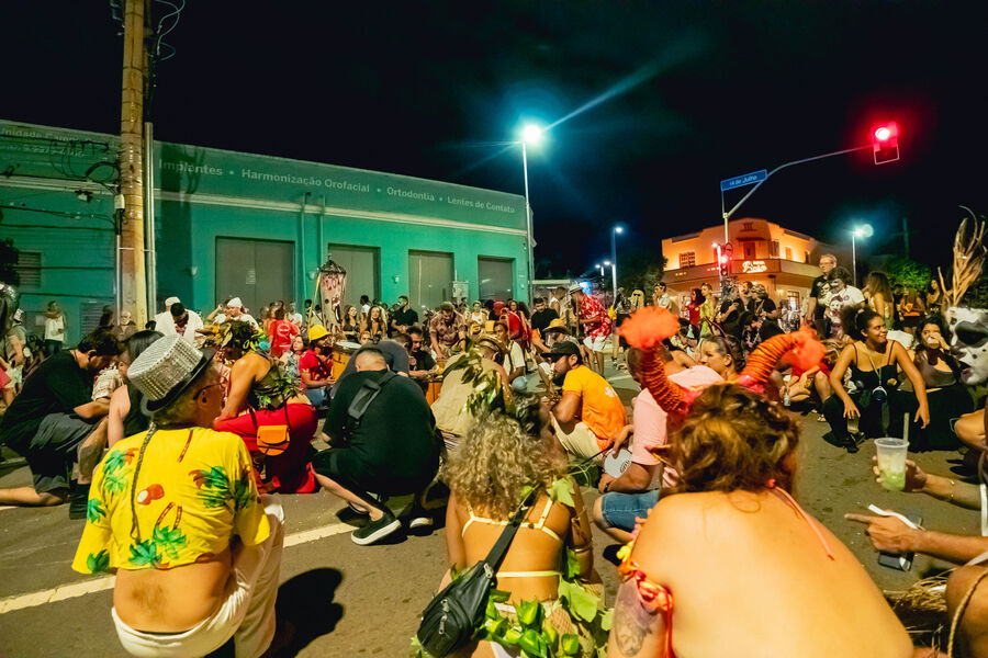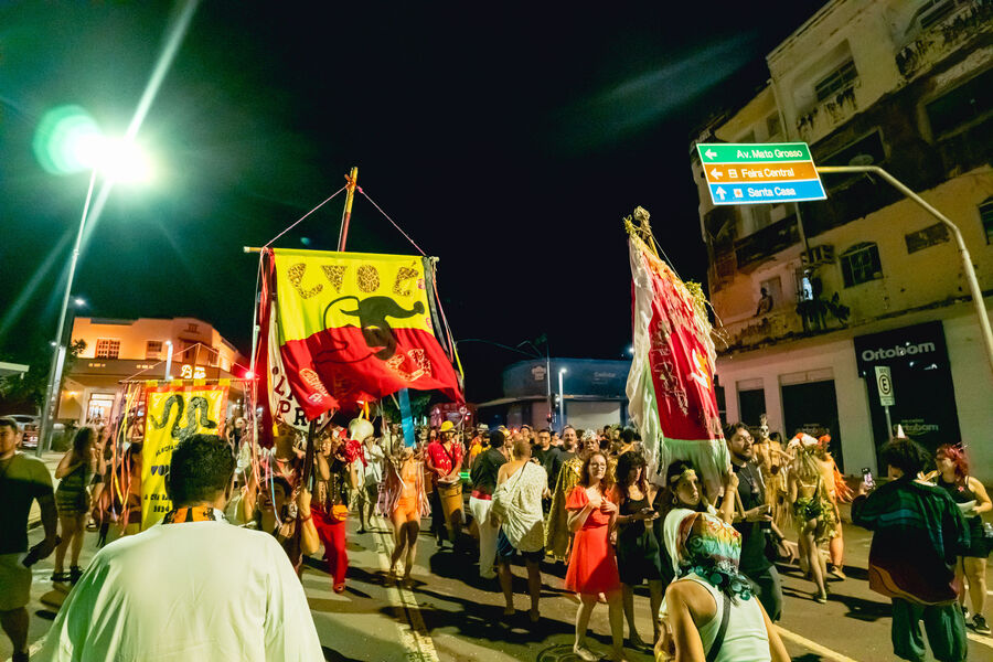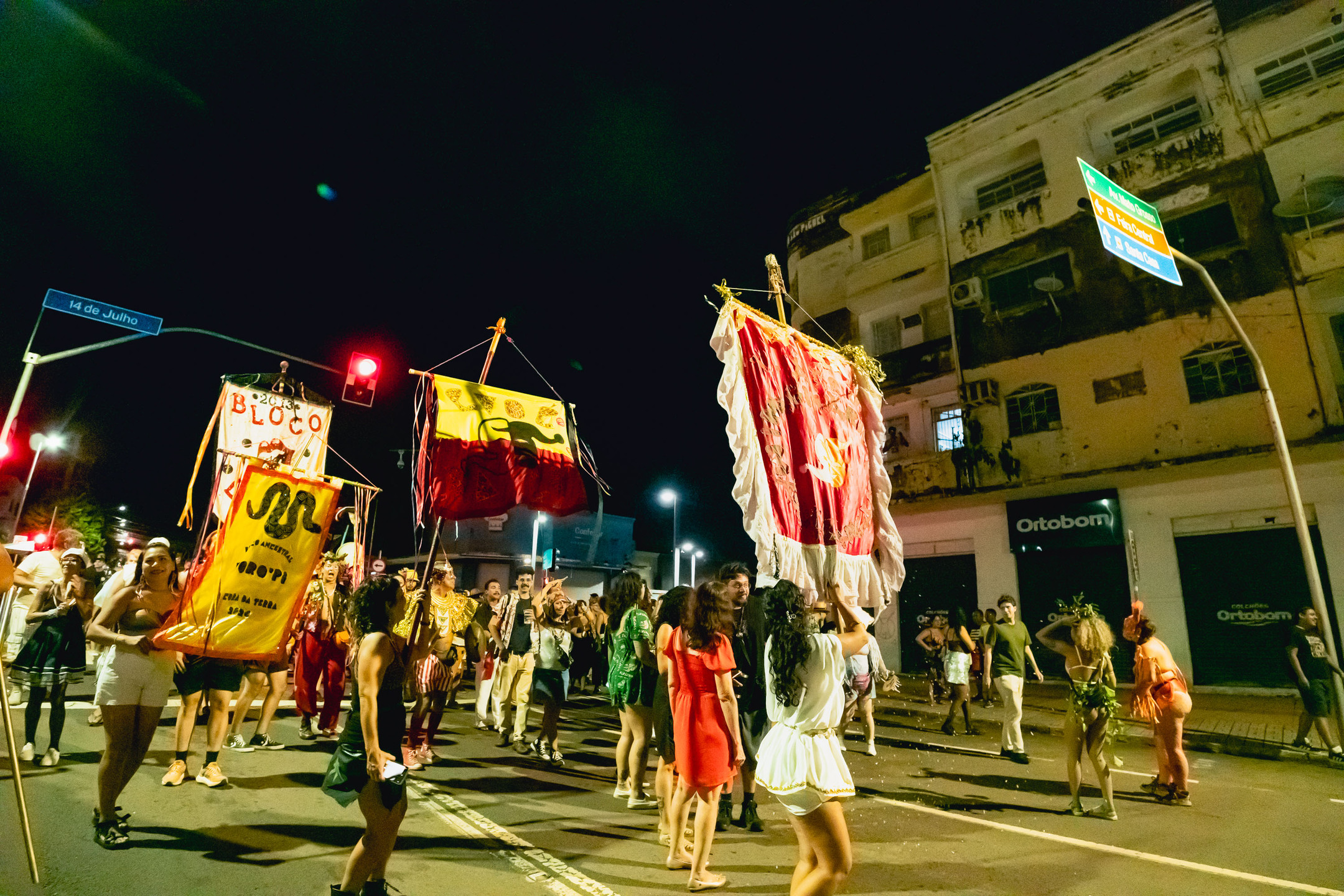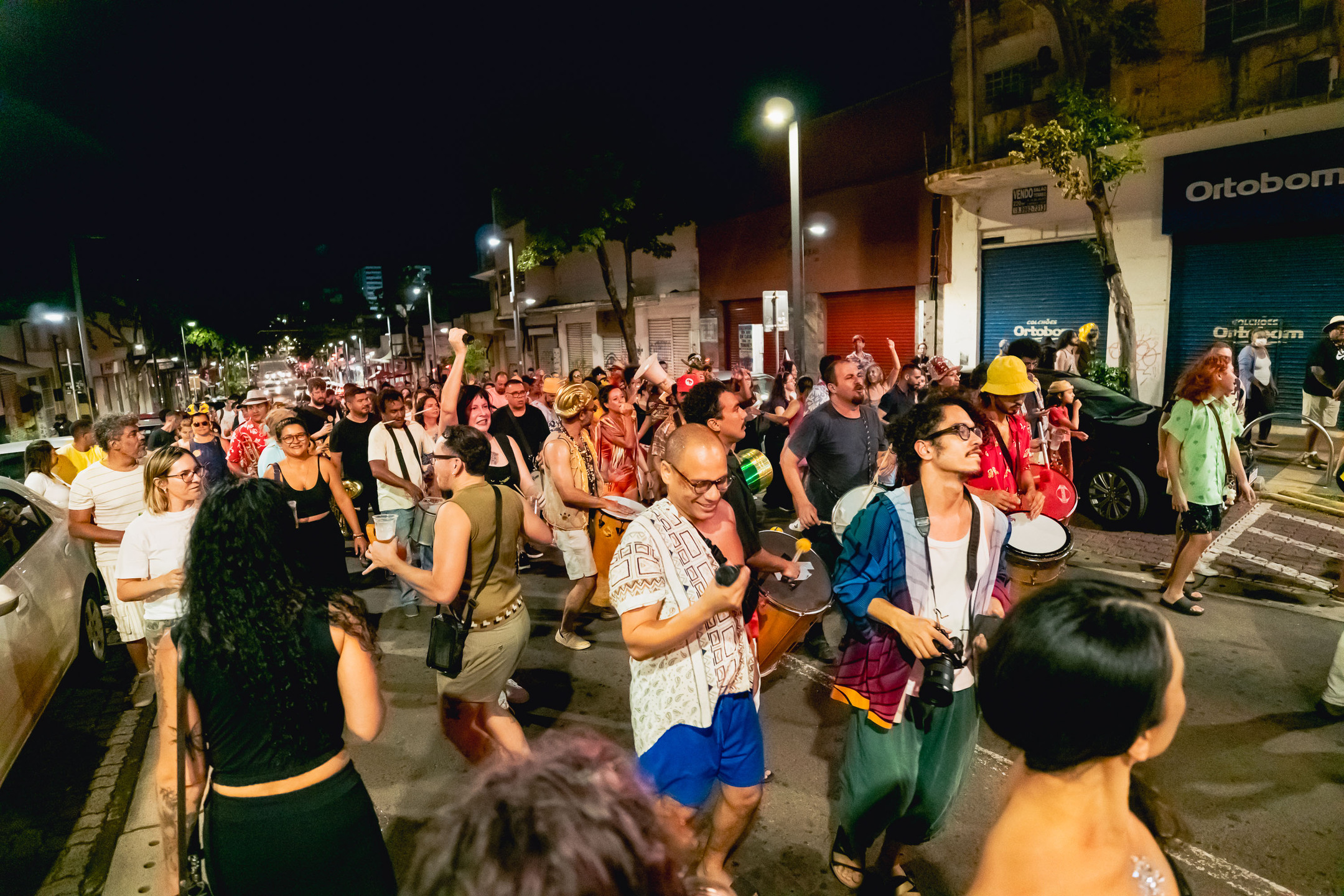 A Rua 14 de Julho, artéria pulsante do comércio e do “centro do capital” em Campo Grande (MS), teve sua lógica subvertida na noite desta 5ª feira (12.fev.26). Onde normalmente impera a pressa do trabalhador ou o fluxo do consumo, o Bloco Carnavalesco Evoé Baco, do grupo de teatro e ponto de cultura Imaginário Maracangalha, instaurou outra ordem: a do encontro.