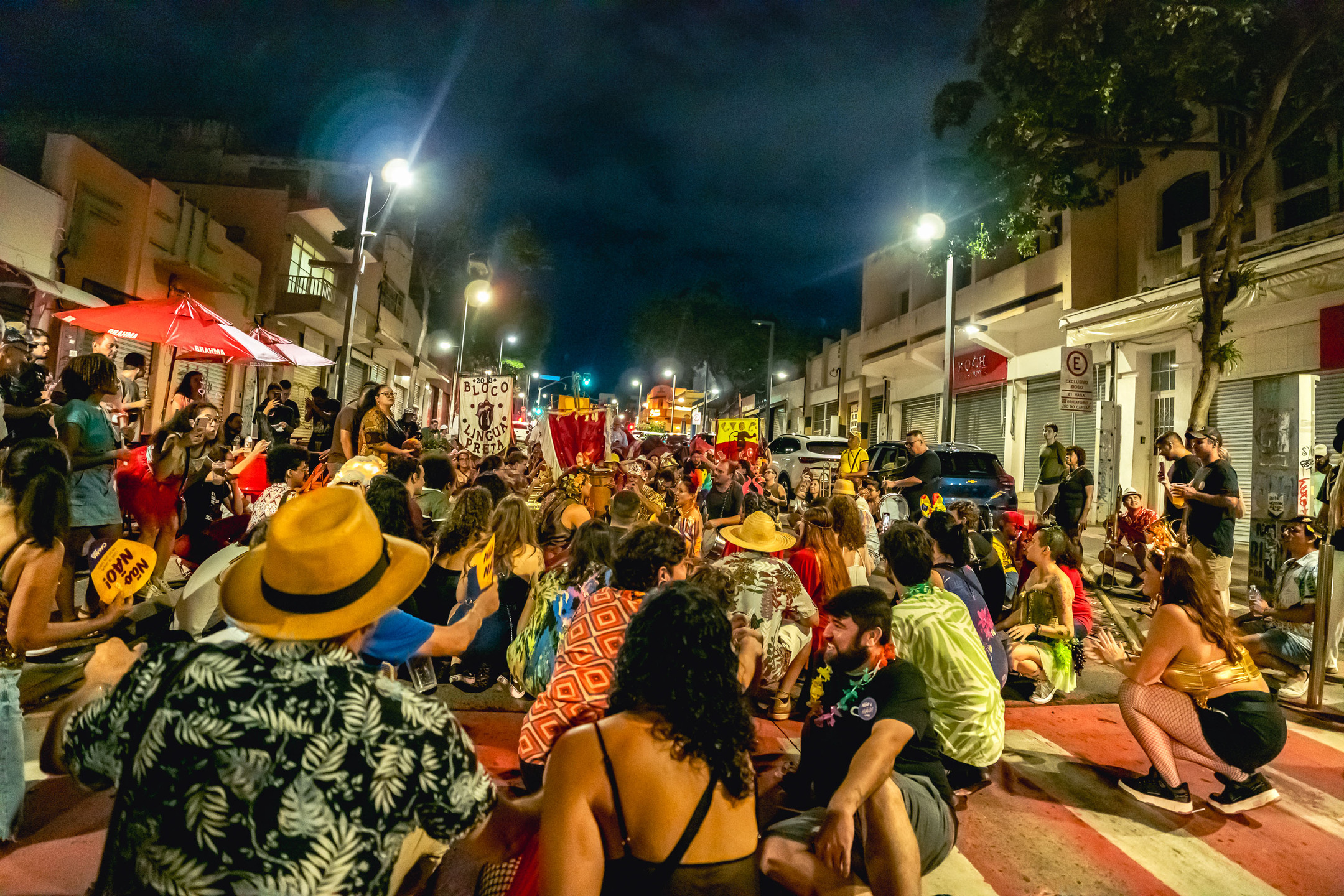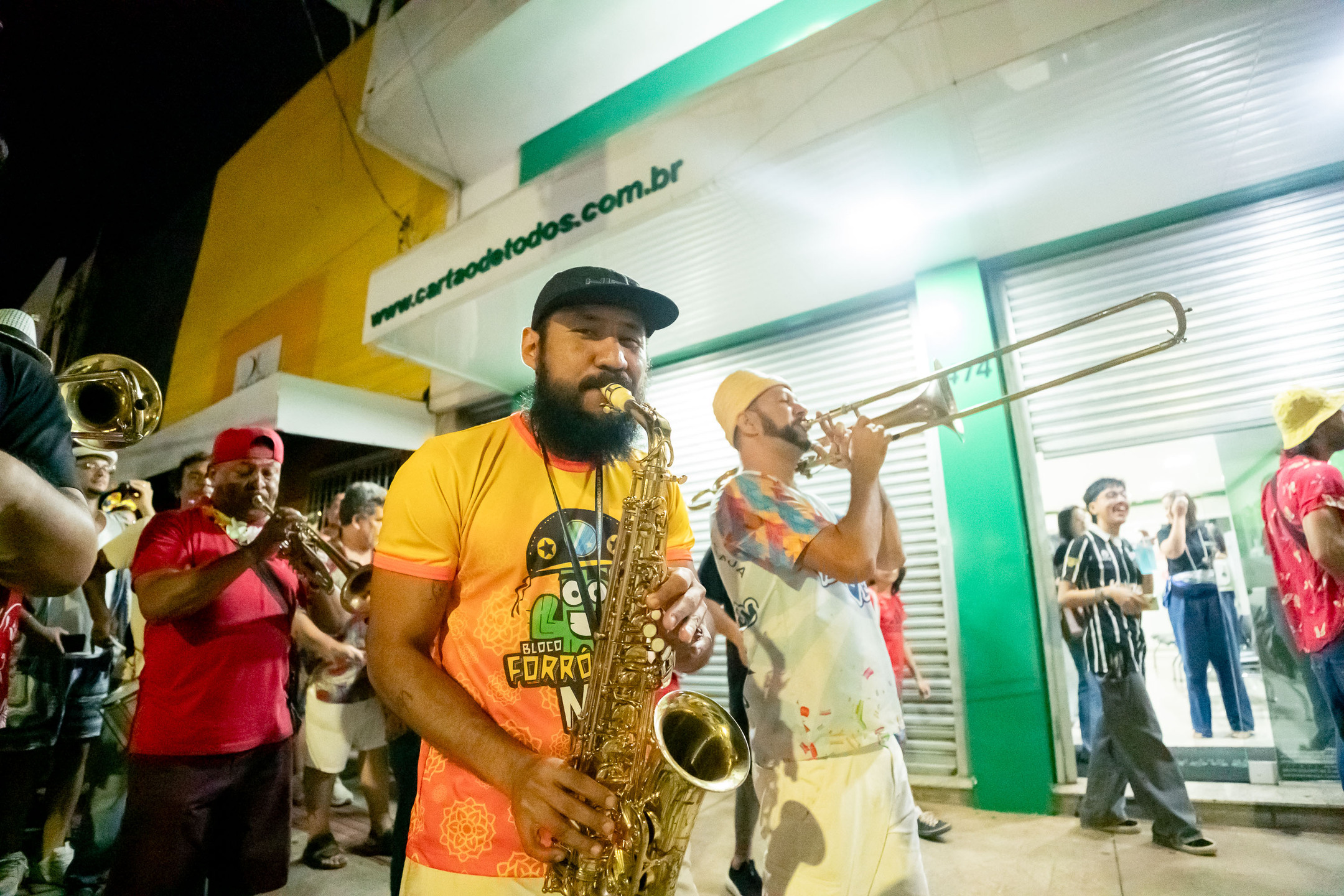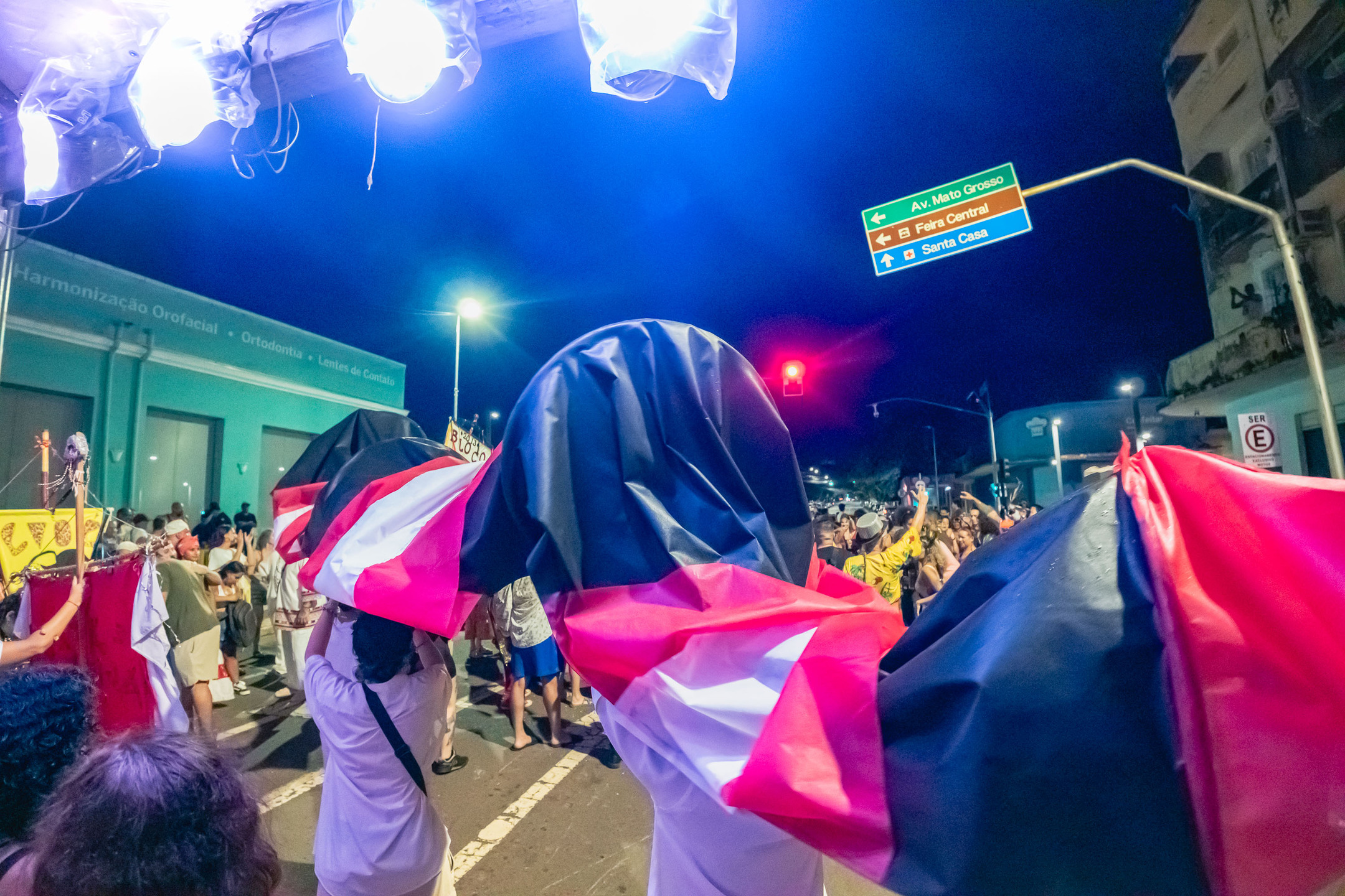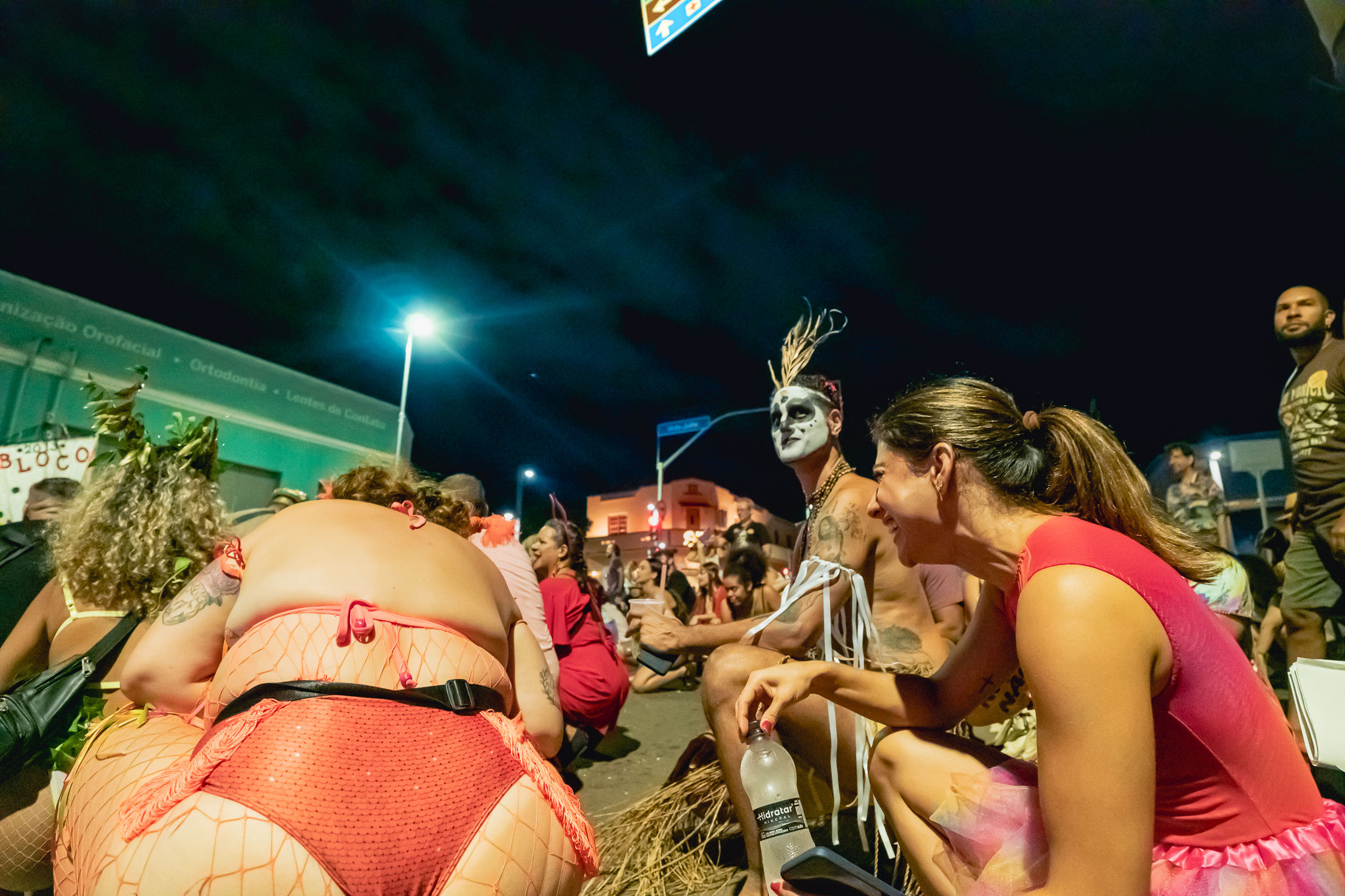 A Rua 14 de Julho, artéria pulsante do comércio e do “centro do capital” em Campo Grande (MS), teve sua lógica subvertida na noite desta 5ª feira (12.fev.26). Onde normalmente impera a pressa do trabalhador ou o fluxo do consumo, o Bloco Carnavalesco Evoé Baco, do grupo de teatro e ponto de cultura Imaginário Maracangalha, instaurou outra ordem: a do encontro.