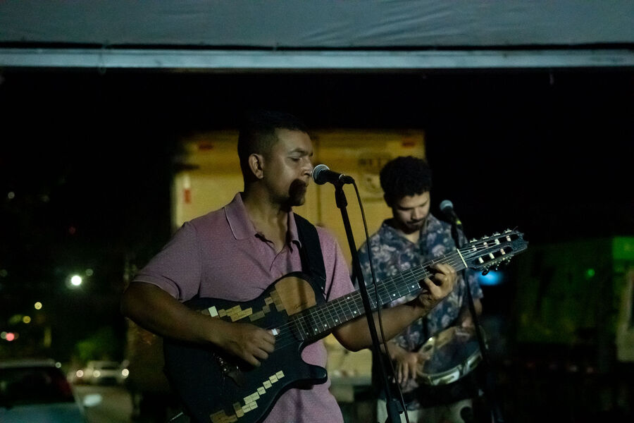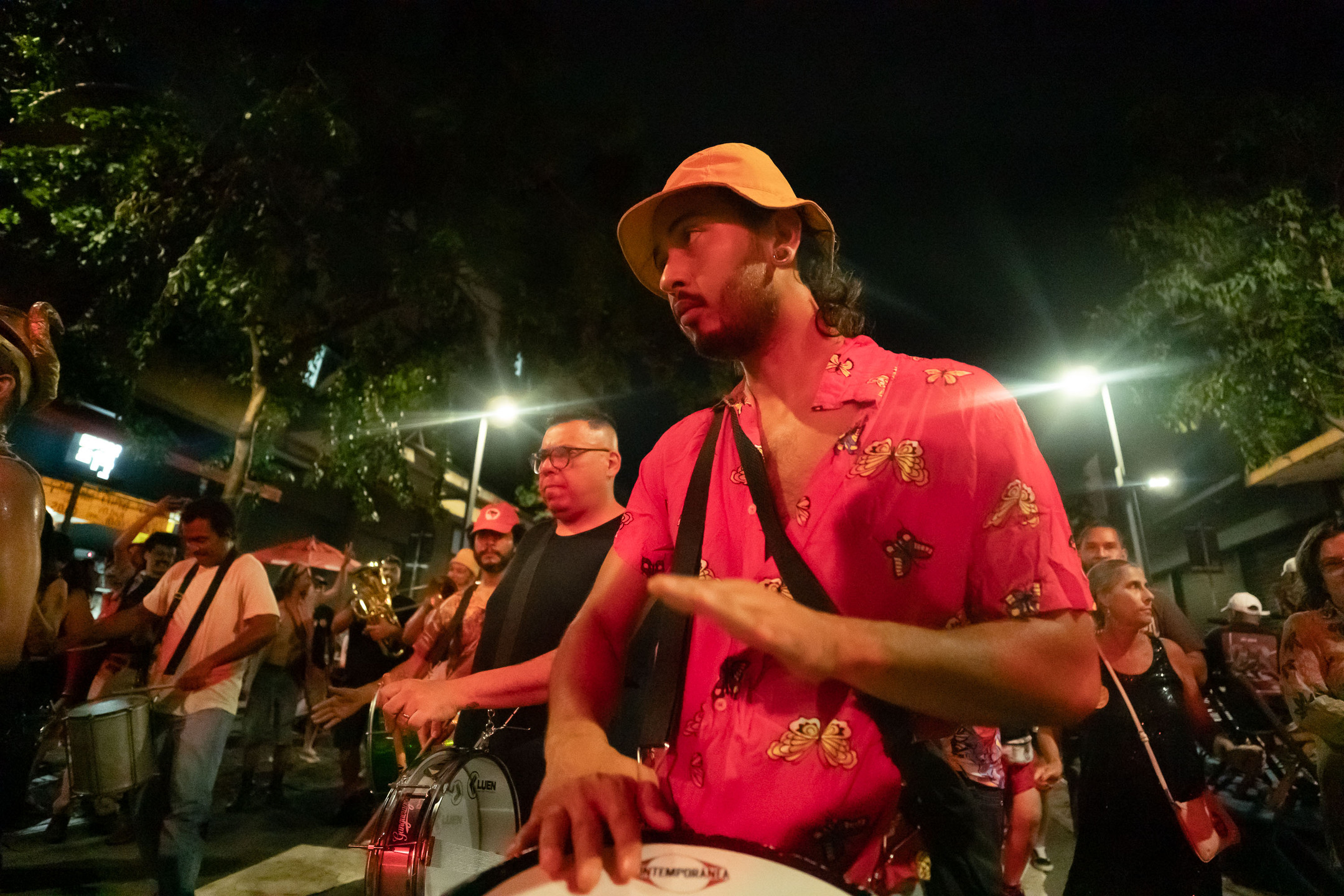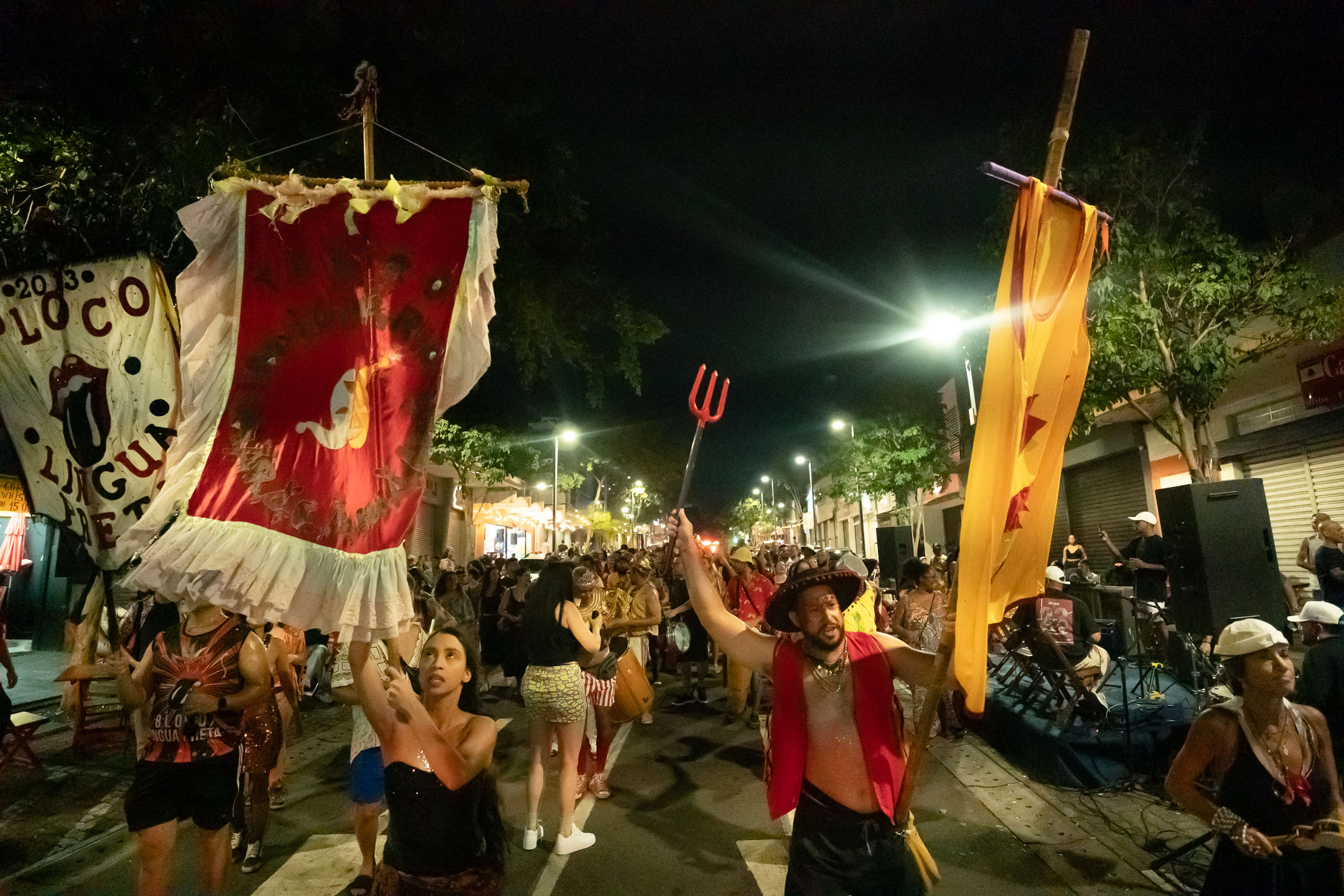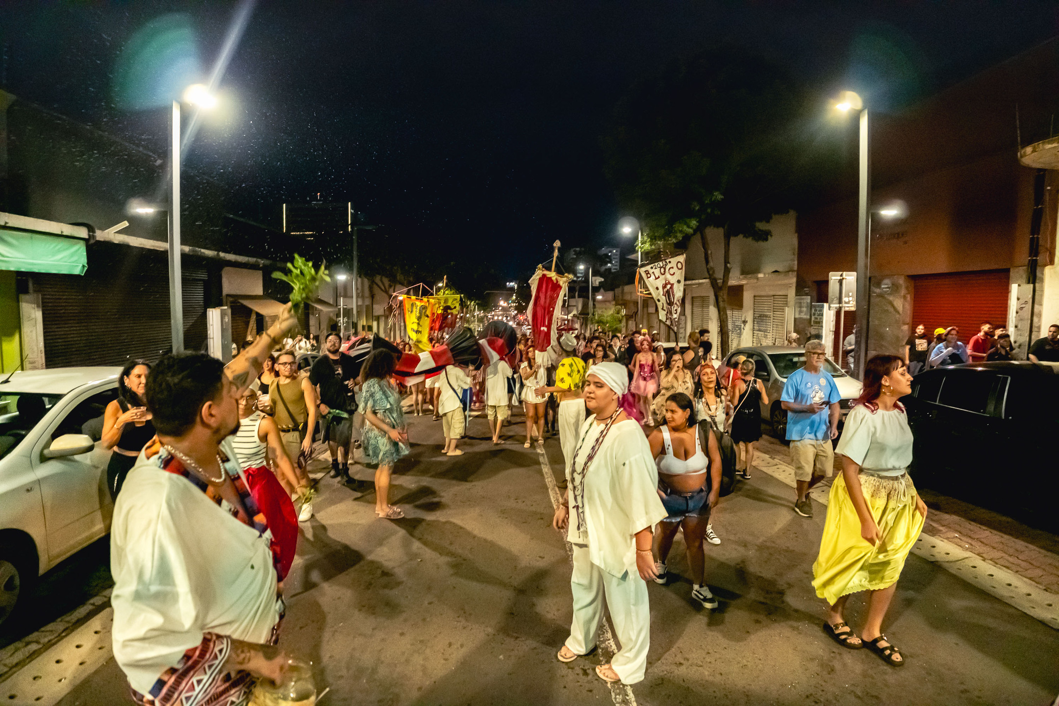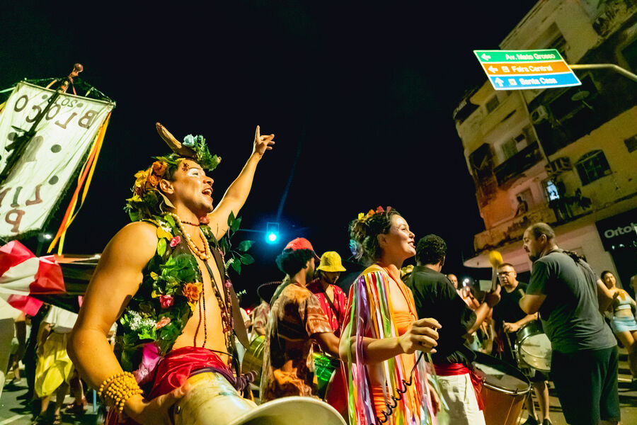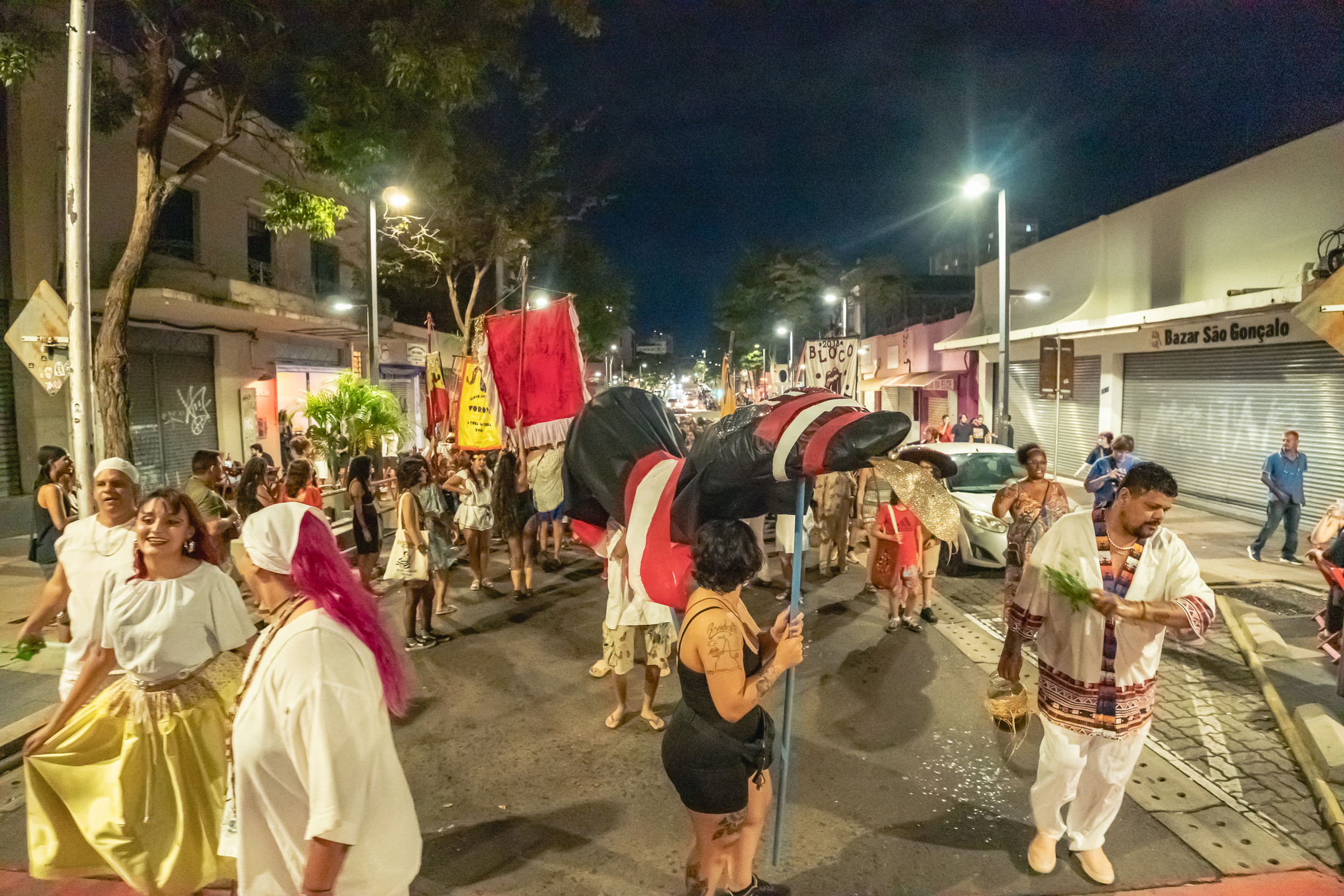 A Rua 14 de Julho, artéria pulsante do comércio e do “centro do capital” em Campo Grande (MS), teve sua lógica subvertida na noite desta 5ª feira (12.fev.26). Onde normalmente impera a pressa do trabalhador ou o fluxo do consumo, o Bloco Carnavalesco Evoé Baco, do grupo de teatro e ponto de cultura Imaginário Maracangalha, instaurou outra ordem: a do encontro.