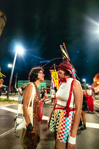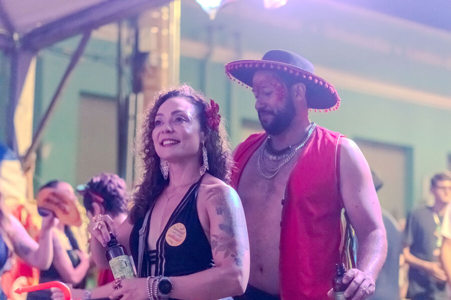(12.fev.26) - Moreno Mourão e Fran Corona, integrantes do Teatro Imaginário Maracangalha e realizadores do Bloco Evoé Baco. Foto: Tero Queiroz