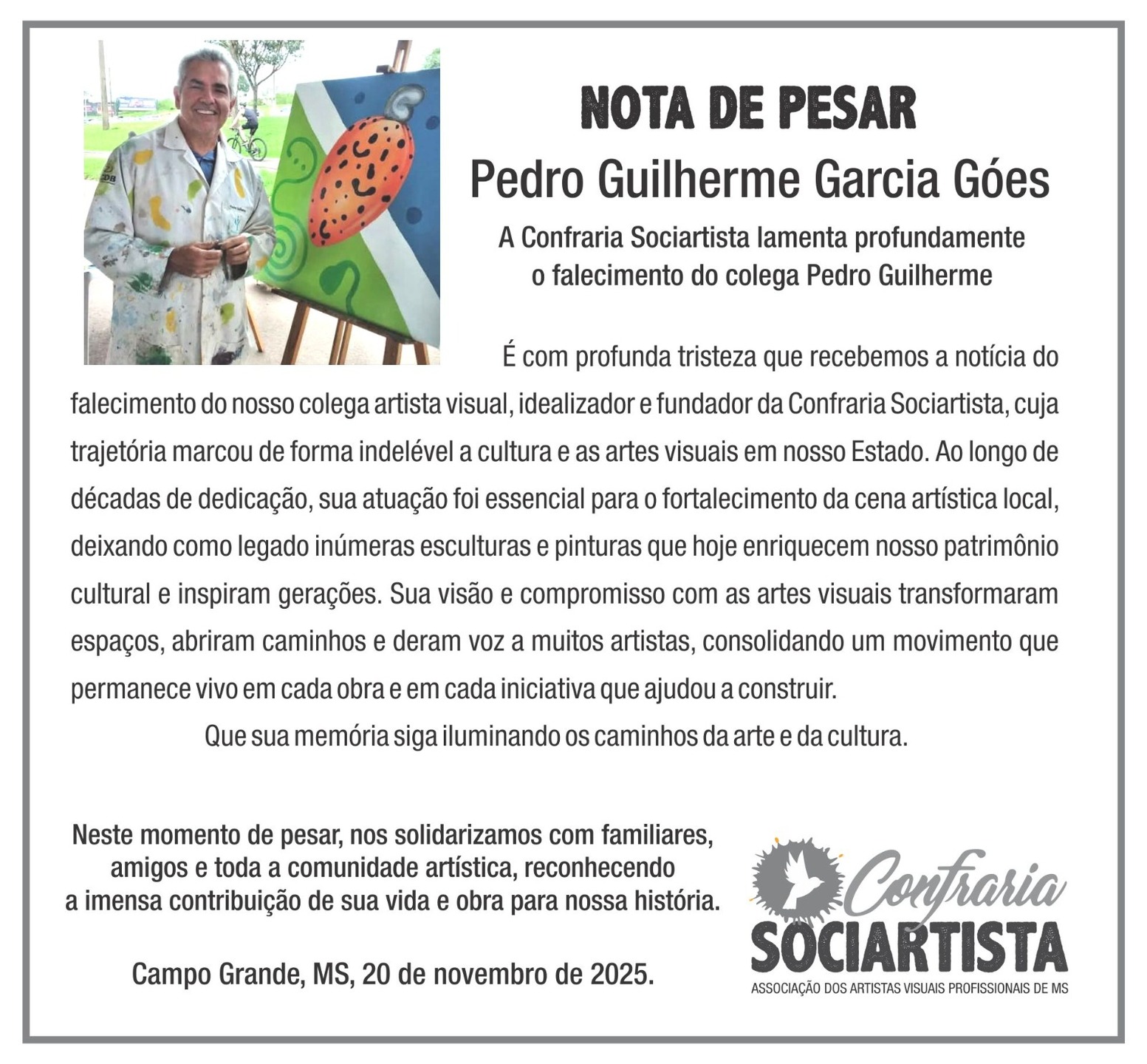 A Fundação de Cultura de Mato Grosso do Sul manifesta profundo pesar pelo falecimento de Pedro Guilherme Garcia Gois, artista natural de Coxim e figura essencial para a construção da identidade cultural sul-mato-grossense.